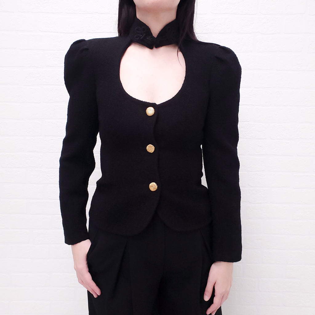 ALESSANDRA RICH BLACK CORD TRIMMED CUT OUT BOUCLE JACKET - SIZE 40