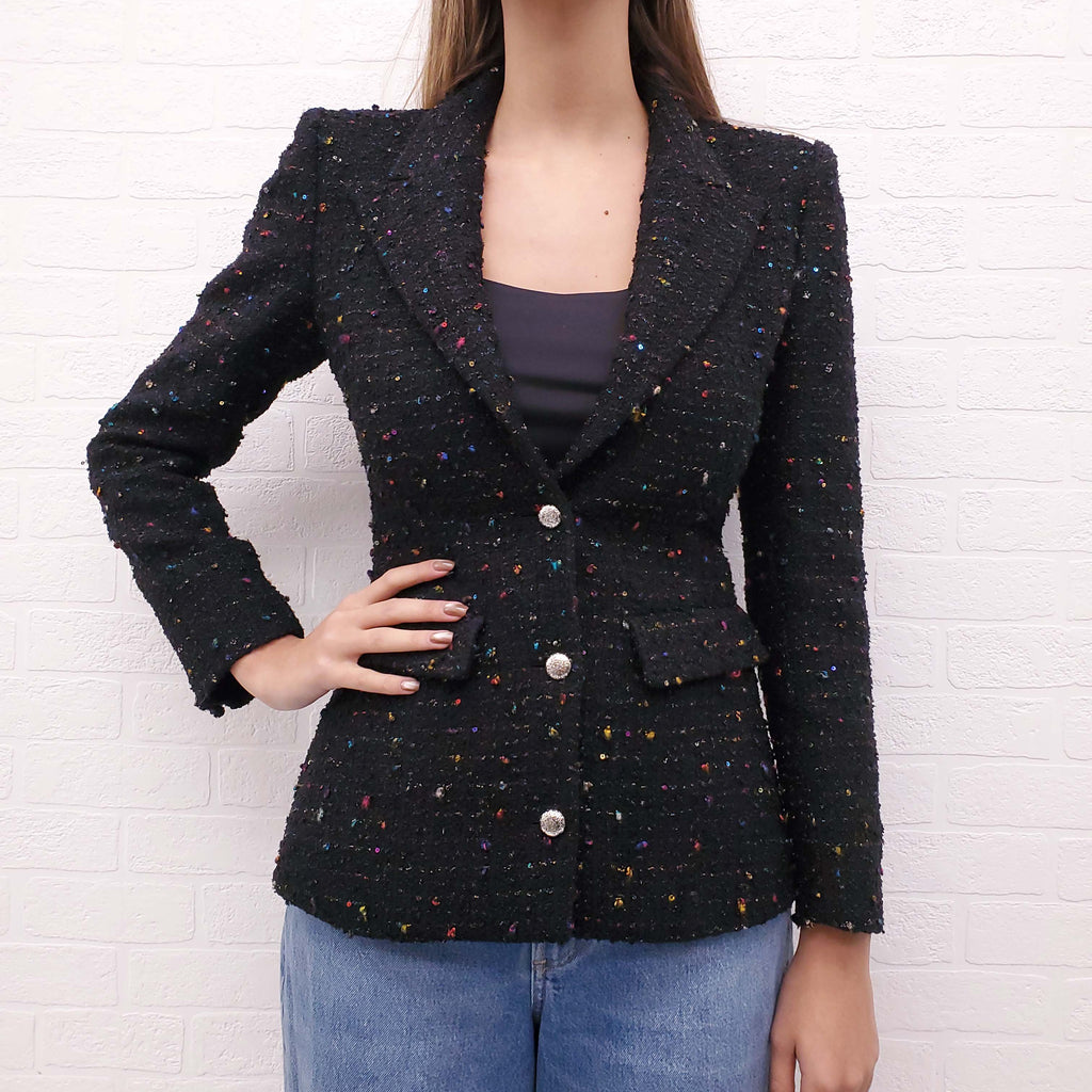 ALESSANDRA RICH BLACK AND MULTI-COLOUR TWEED SEQUIN JACKET - SIZE 38