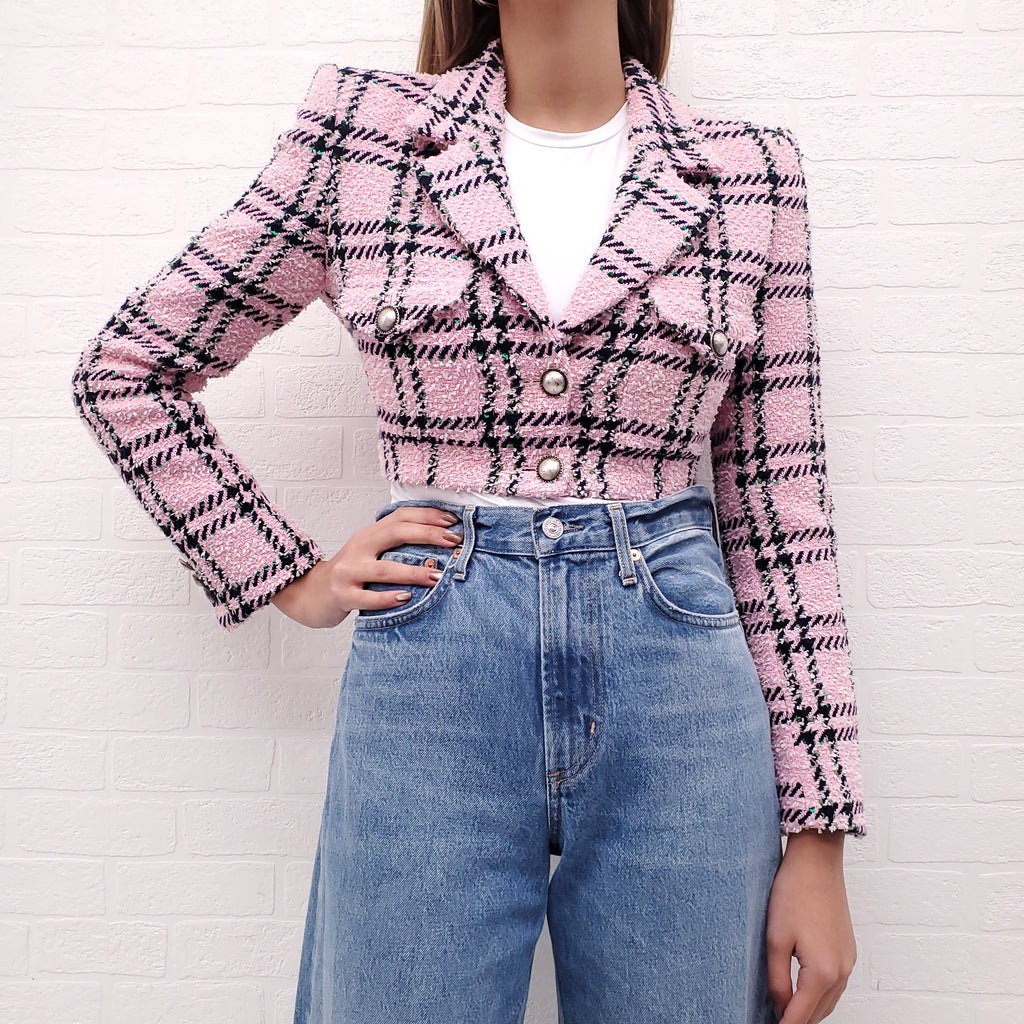 ALESSANDRA RICH PINK TWEED PLAID JACKET WITH PEARL BUTTONS - SIZE 40