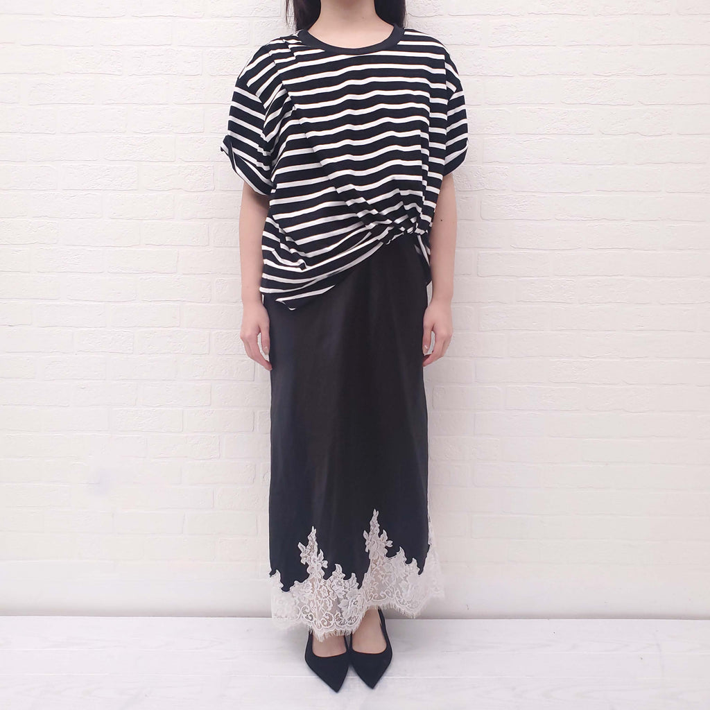 3.1 PHILLIP LIM BLACK AND WHITE STRIPED T-SHIRT DRESS WITH SATIN EFFECT LACE BOTTOM - SIZE L