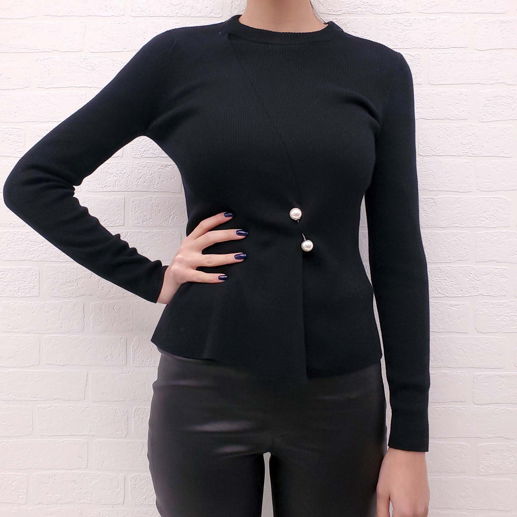 3.1 PHILLIP LIM BLACK RIBBED SWEATER WITH PEARL DETAIL - SIZE XS