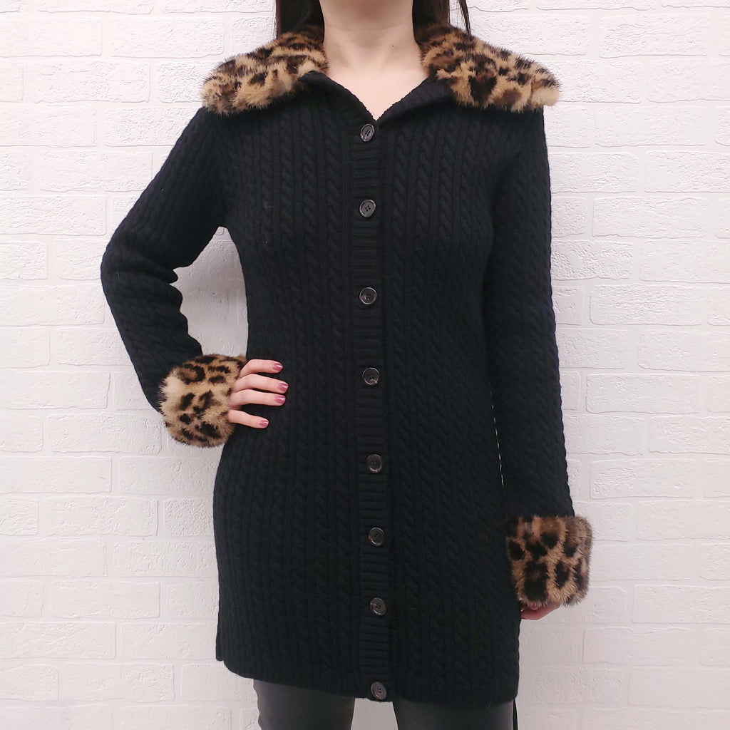 SAINT LAURENT BLACK WOOL CABLE KNIT CARDIGAN WITH LEOPARD MINK COLLAR AND CUFFS - SIZE L