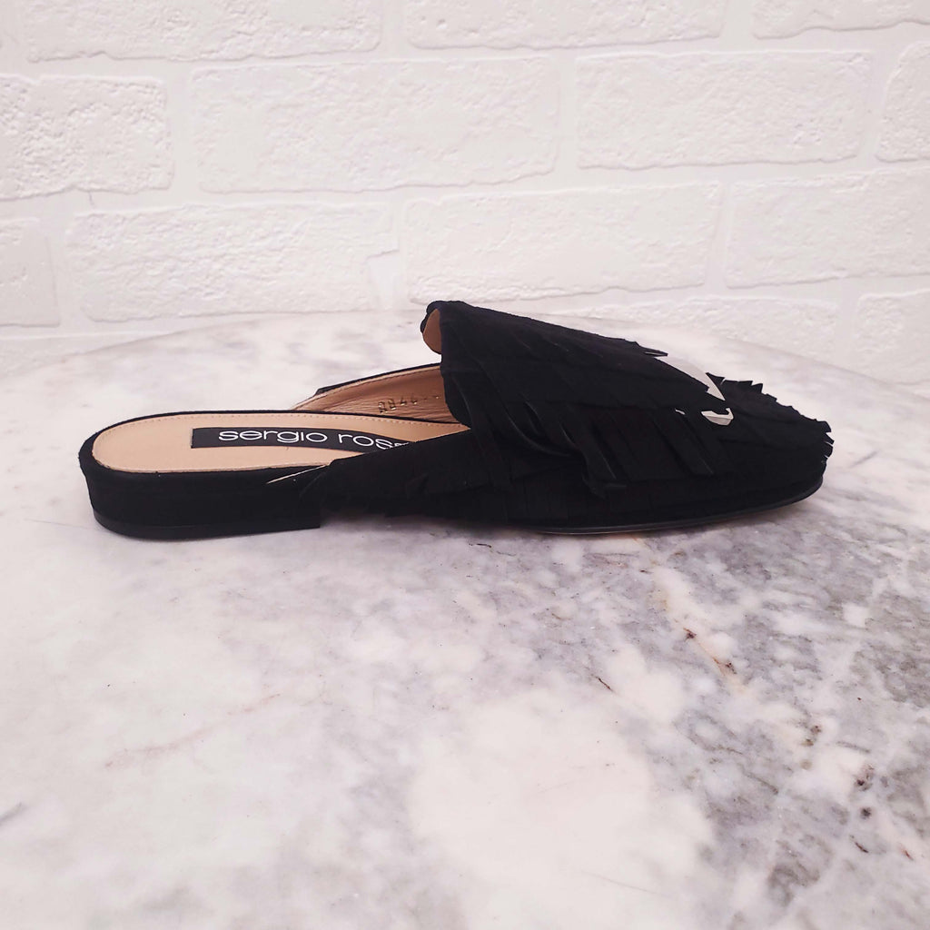 SERGIO ROSSI BLACK SUEDE FRINGE SLIDES - SIZE 35