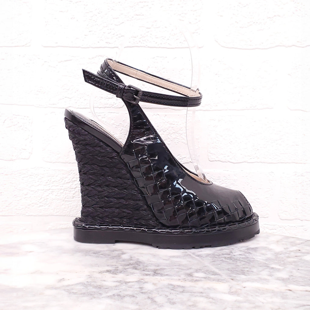 BOTTEGA VENETA BLACK PATENT STITCHED AND CORK WEDGE HEEL - SIZE 37
