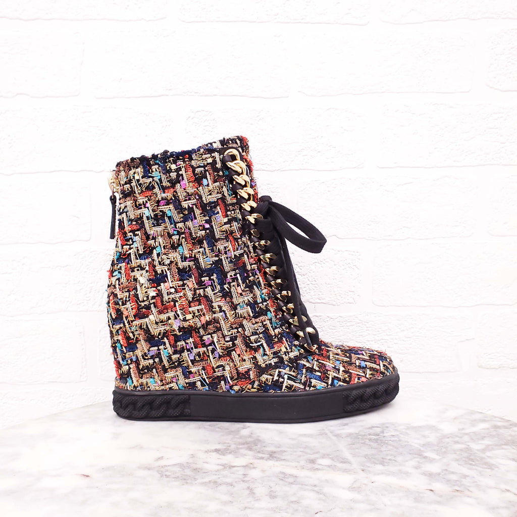 CASADEI MULTI-COLOUR TWEED WEDGE SNEAKERS WITH CHAIN DETAIL - SIZE 7