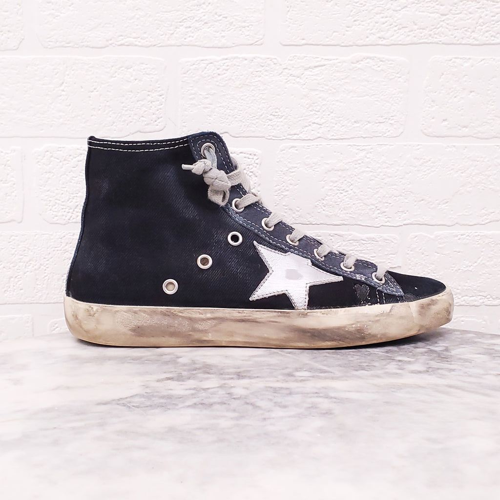 GOLDEN GOOSE FRANCY BLACK DENIM WITH SILVER STAR SNEAKERS - SIZE 37