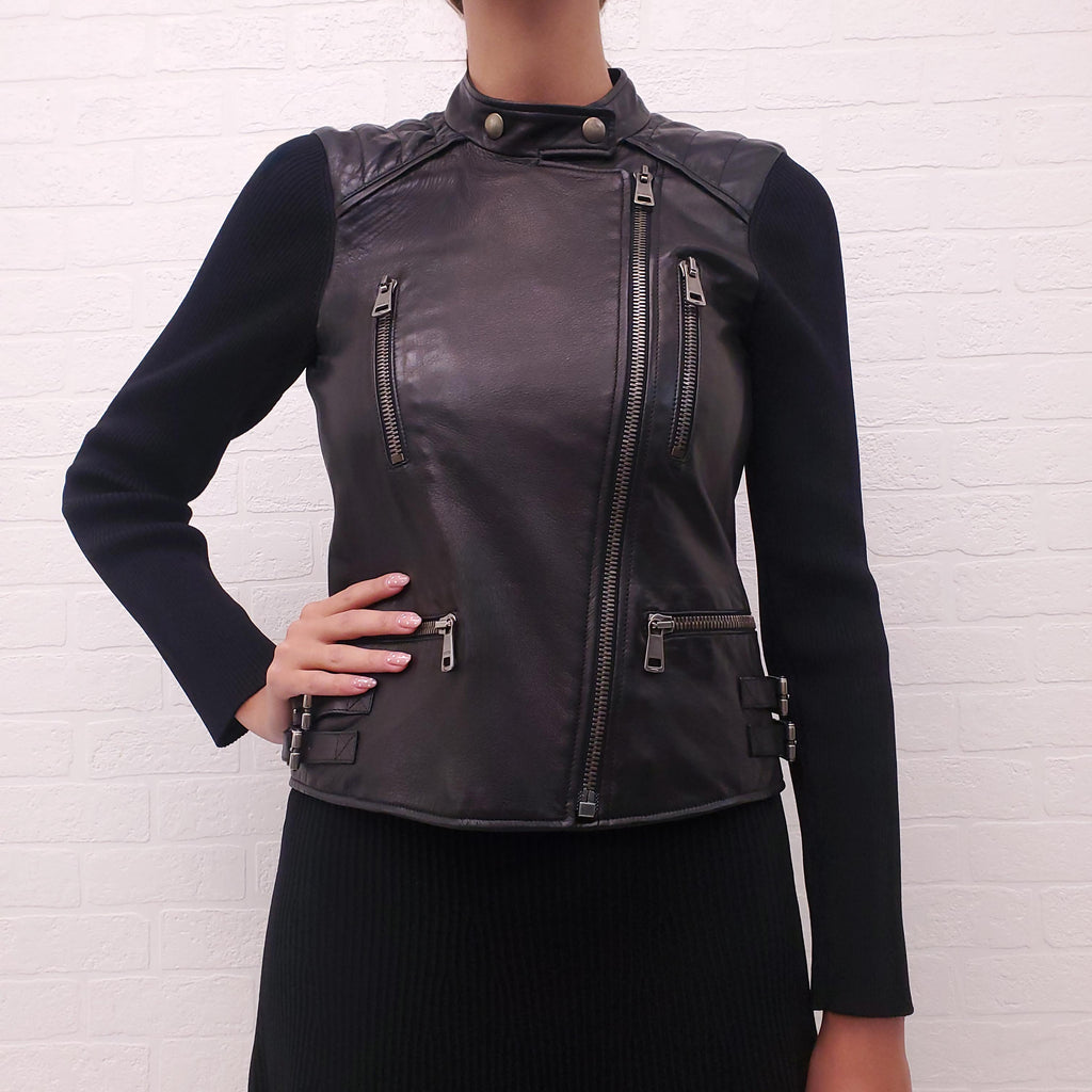 GUCCI BLACK LEATHER MOTORCYCLE JACKET WITH KNIT DETAIL - SIZE 38