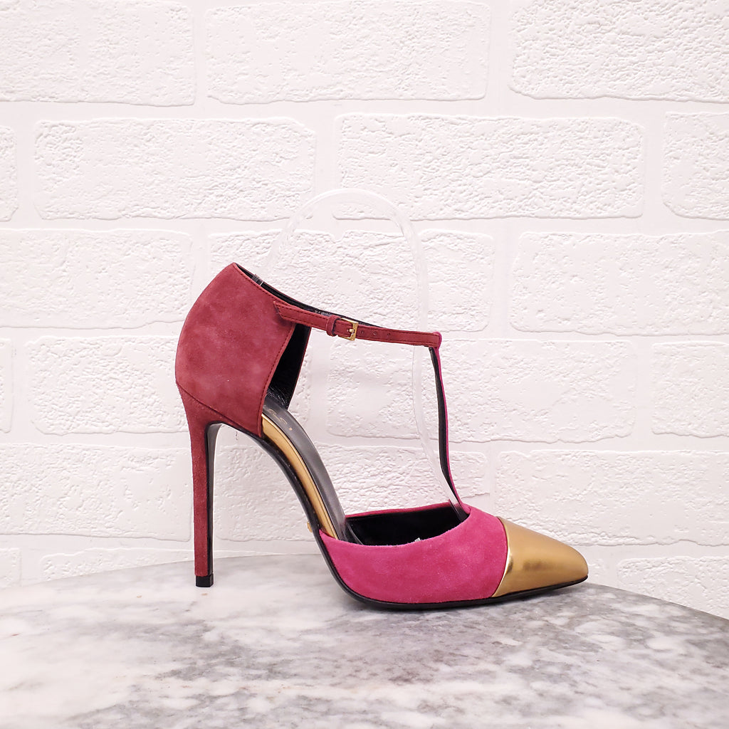 GUCCI FUCHSIA AND BURGUNDY SUEDE T STRAP HEELS WITH GOLD CAP TOE - SIZE 36