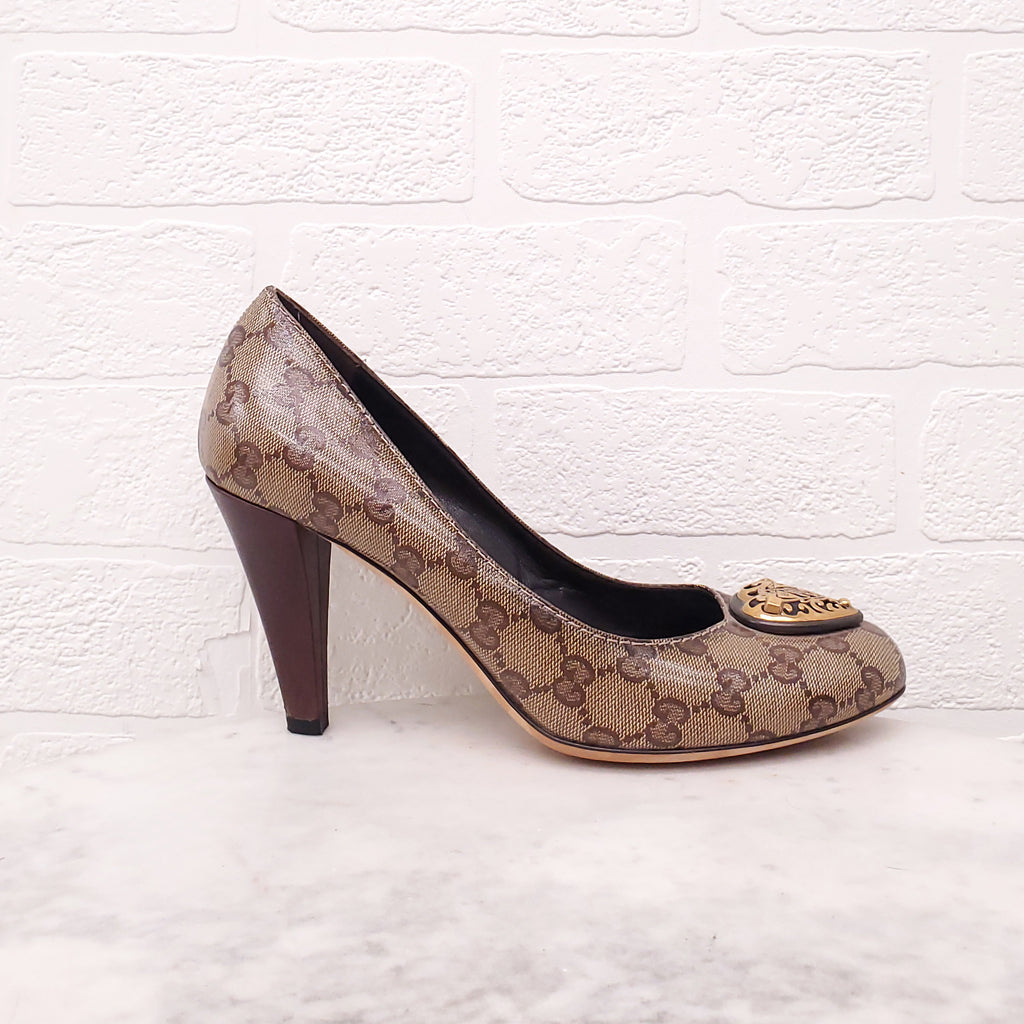 GUCCI LOGO HEELS WITH GOLD HEART EMBLEM - SIZE 39.5