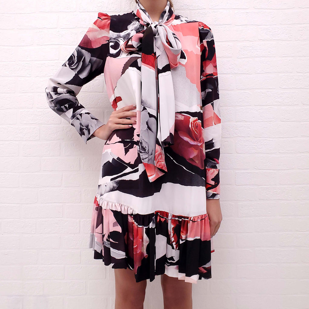 ALEXANDER MCQUEEN PINK AND BLACK SILK ROSE PRINT BABYDOLL DRESS - SIZE 38