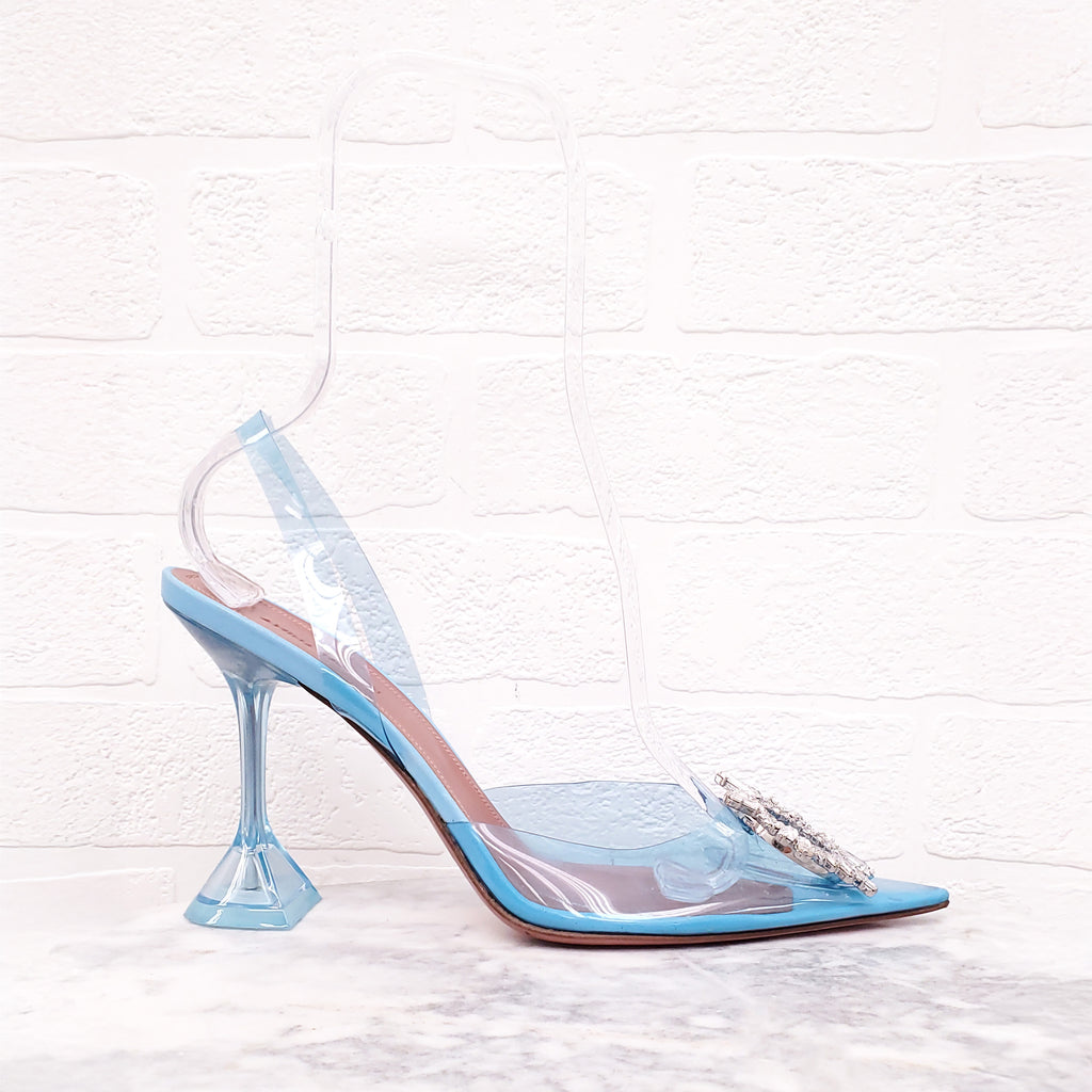 AMINA MUADDI BLUE PVC ROSIE GLASS HEELS WITH CRYSTAL BOW - SIZE 38