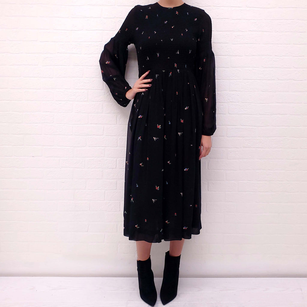 GANNI FLORAL BLACK DRESS WITH RUCHING DETAIL - SIZE 38
