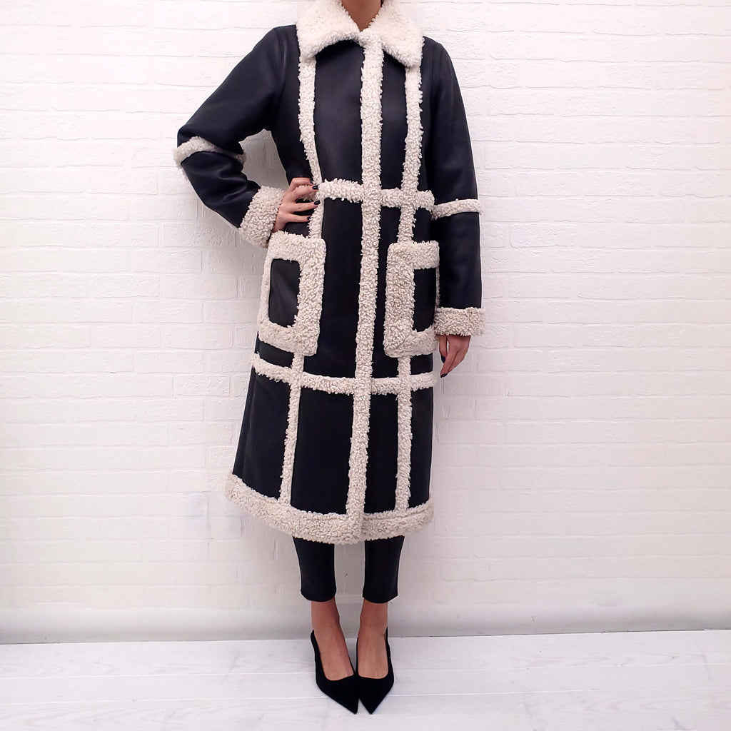 STAND STUDIO OVERSIZED BLACK VEGAN LEATHER AND SHERPA LONG COAT - SIZE 34