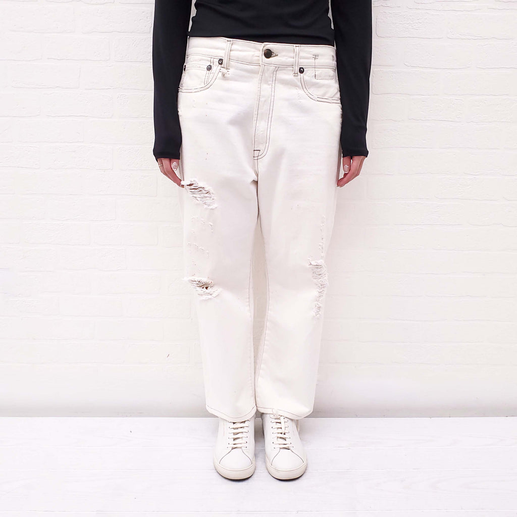 R13 CREAM DISTRESSED 'BOYFRIEND' JEANS WITH LEOPARD DETAIL - SIZE 27