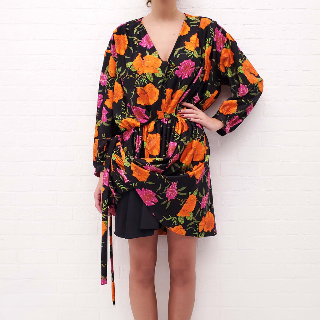 BALENCIAGA BLACK, ORANGE AND PINK FLORAL MINI DRESS WITH TIE - SIZE 38