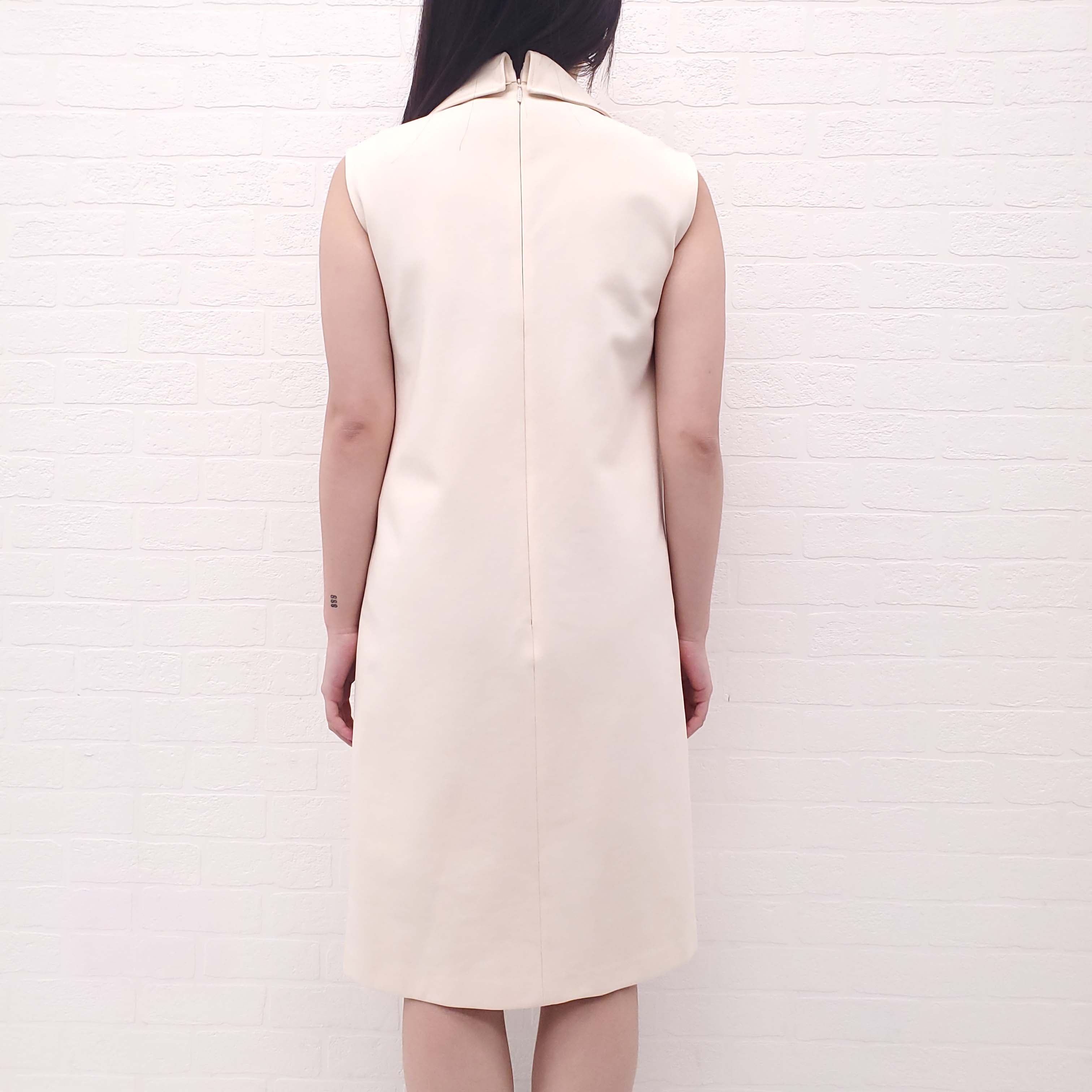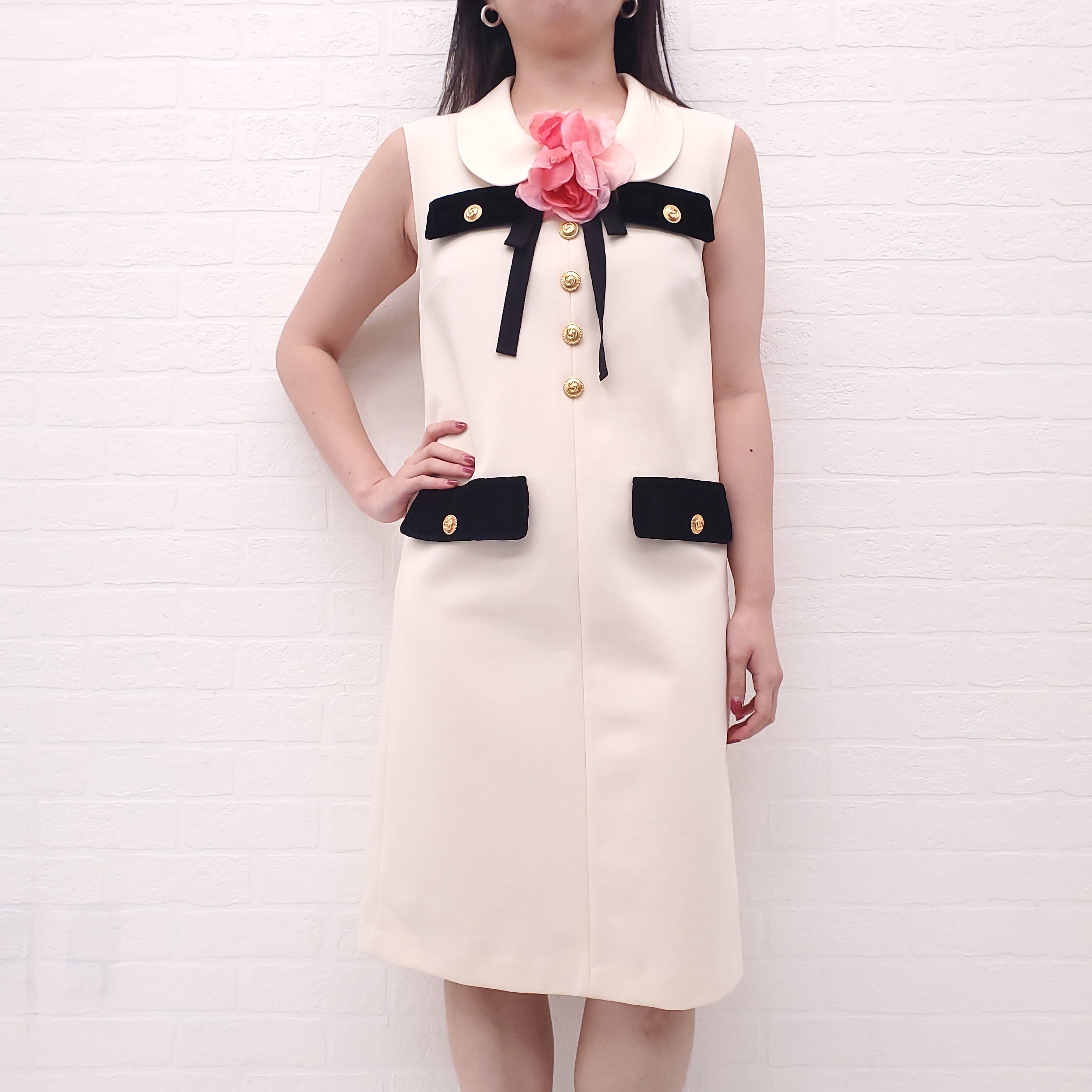 GUCCI CREAM DRESS WITH PINK FLOWER BROOCH AND LOGO BUTTONS - SIZE M