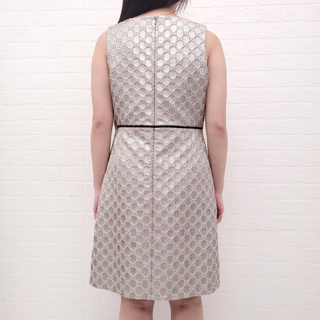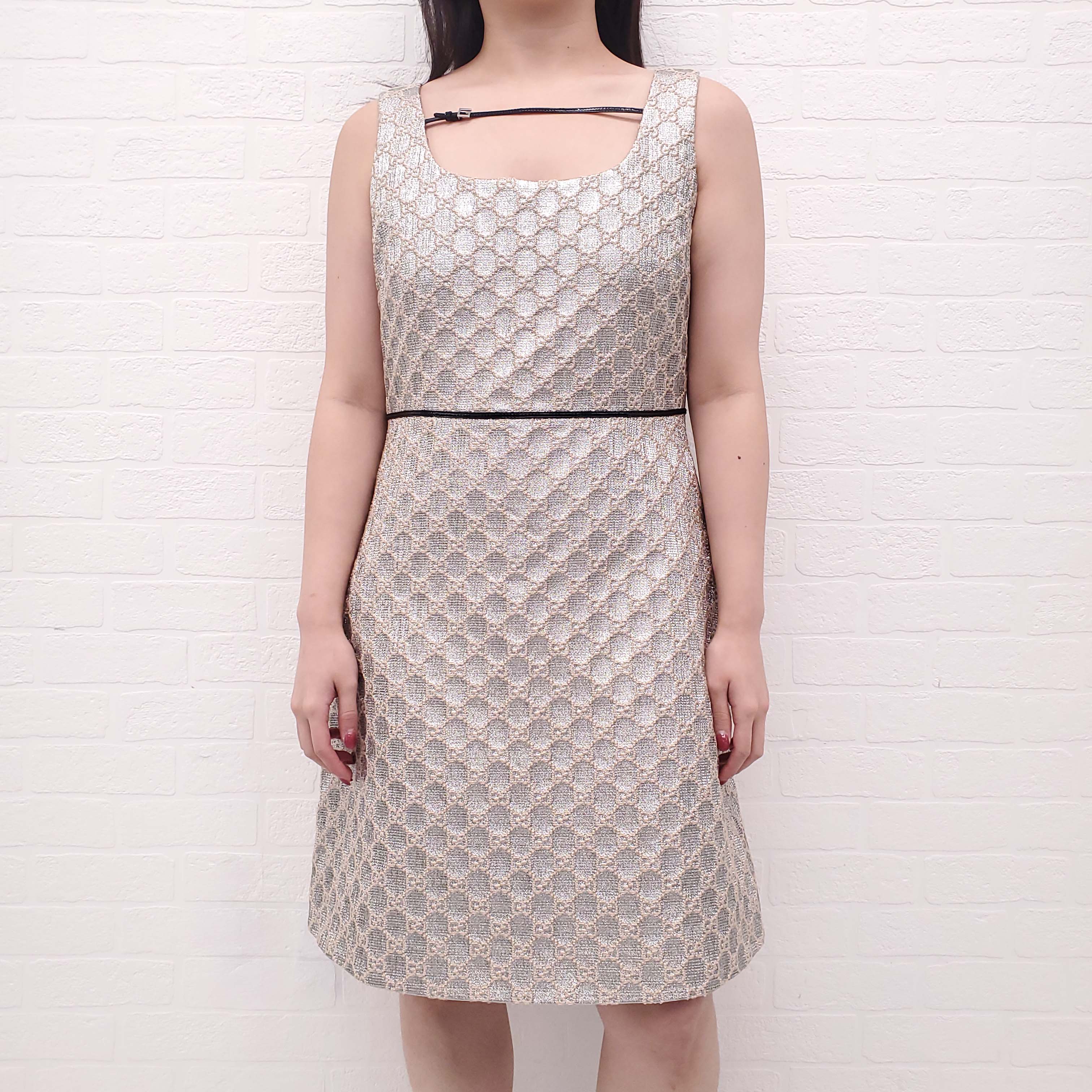 GUCCI SILVER LOGO DRESS WITH LEATHER BUCKLE DETAIL - SIZE 44