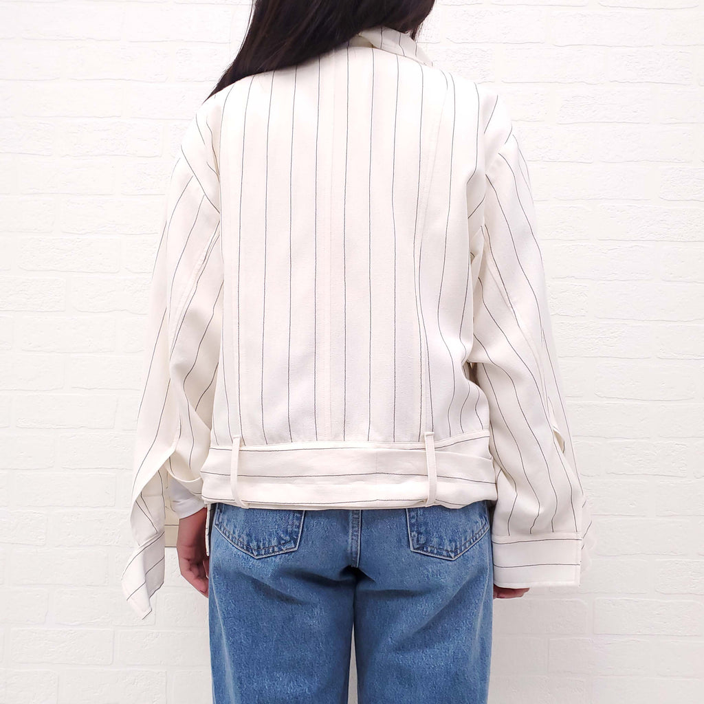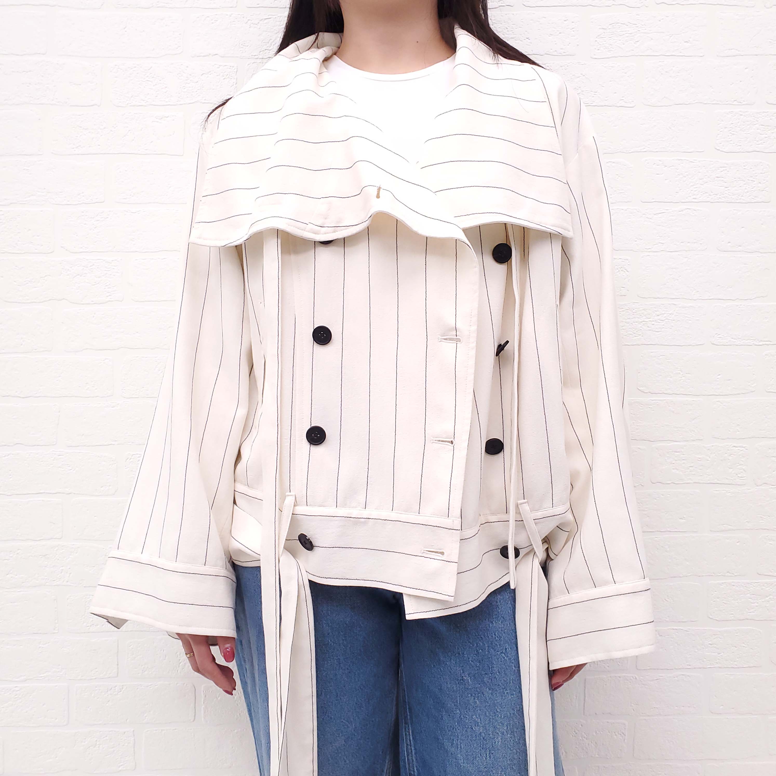 DANIEL GREGORY NATALE CREAM AND BLACK PIN STRIPE DOUBLE BREASTED FUNNEL NECK JACKET