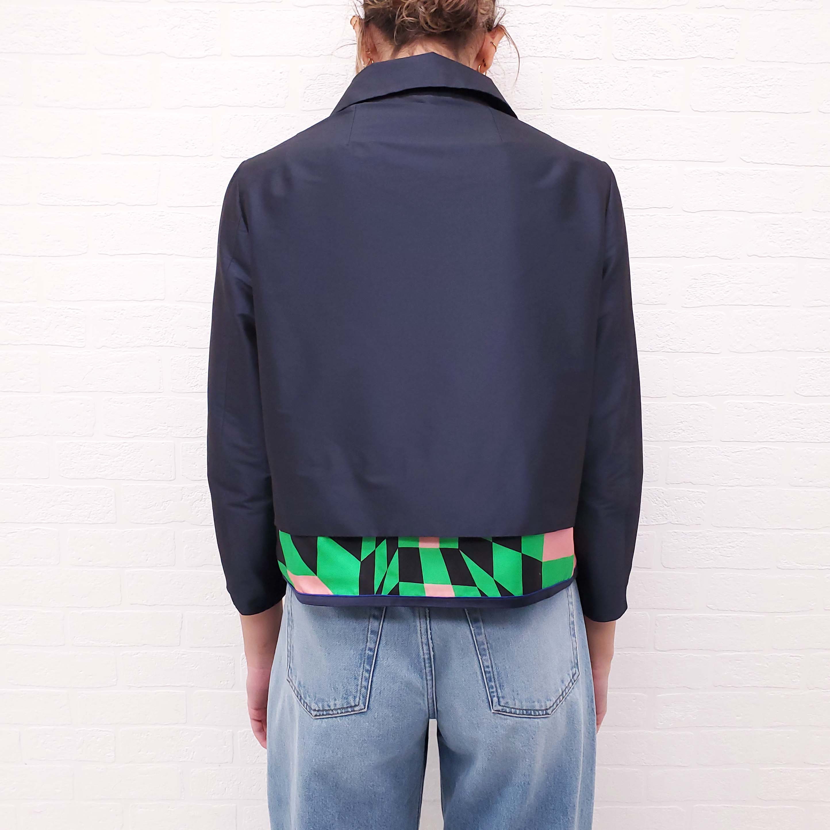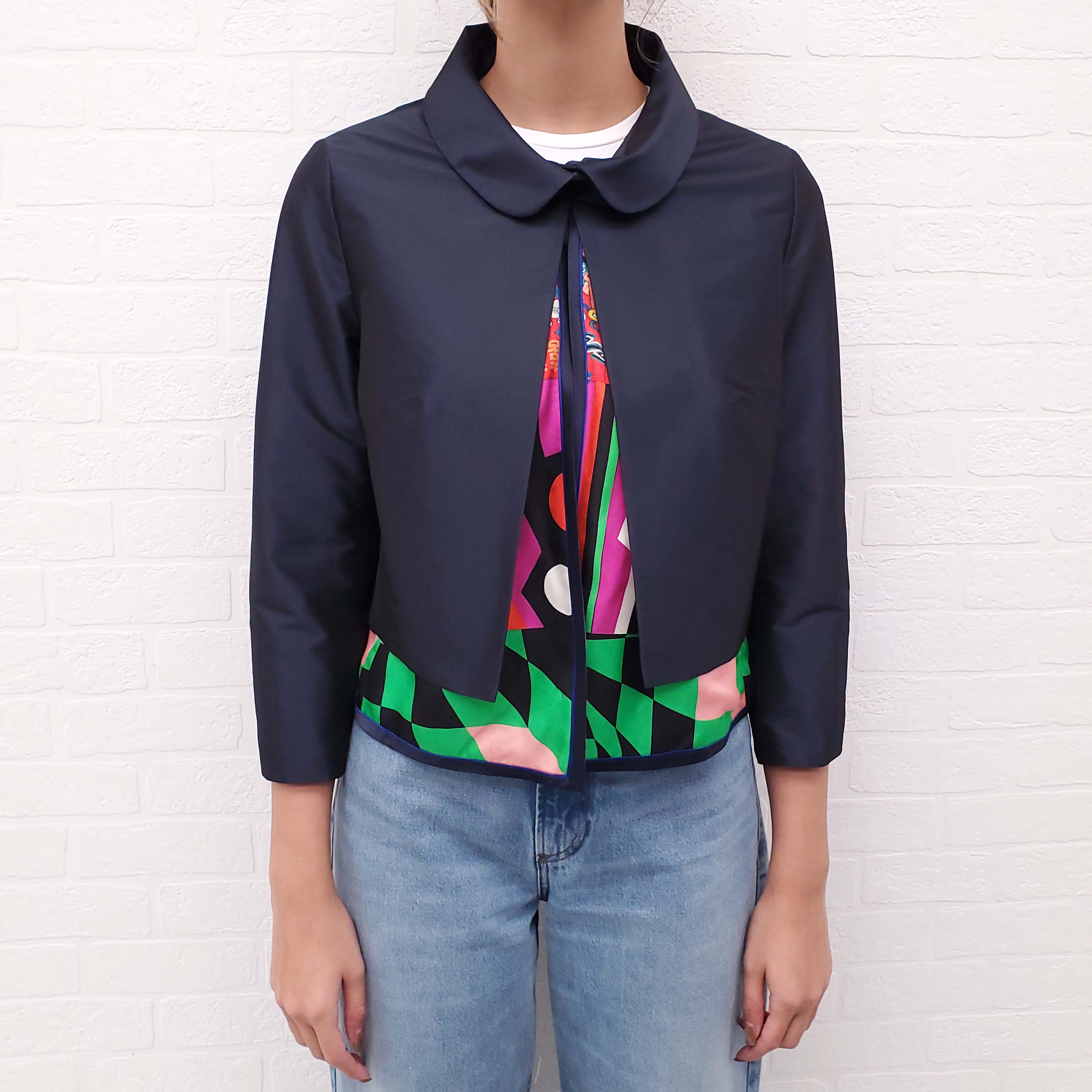 HERNO X PIERRE-LOUIS MASCIA NAVY CROPPED JACKET WITH COLOURFUL SILK DETAIL - SIZE 42