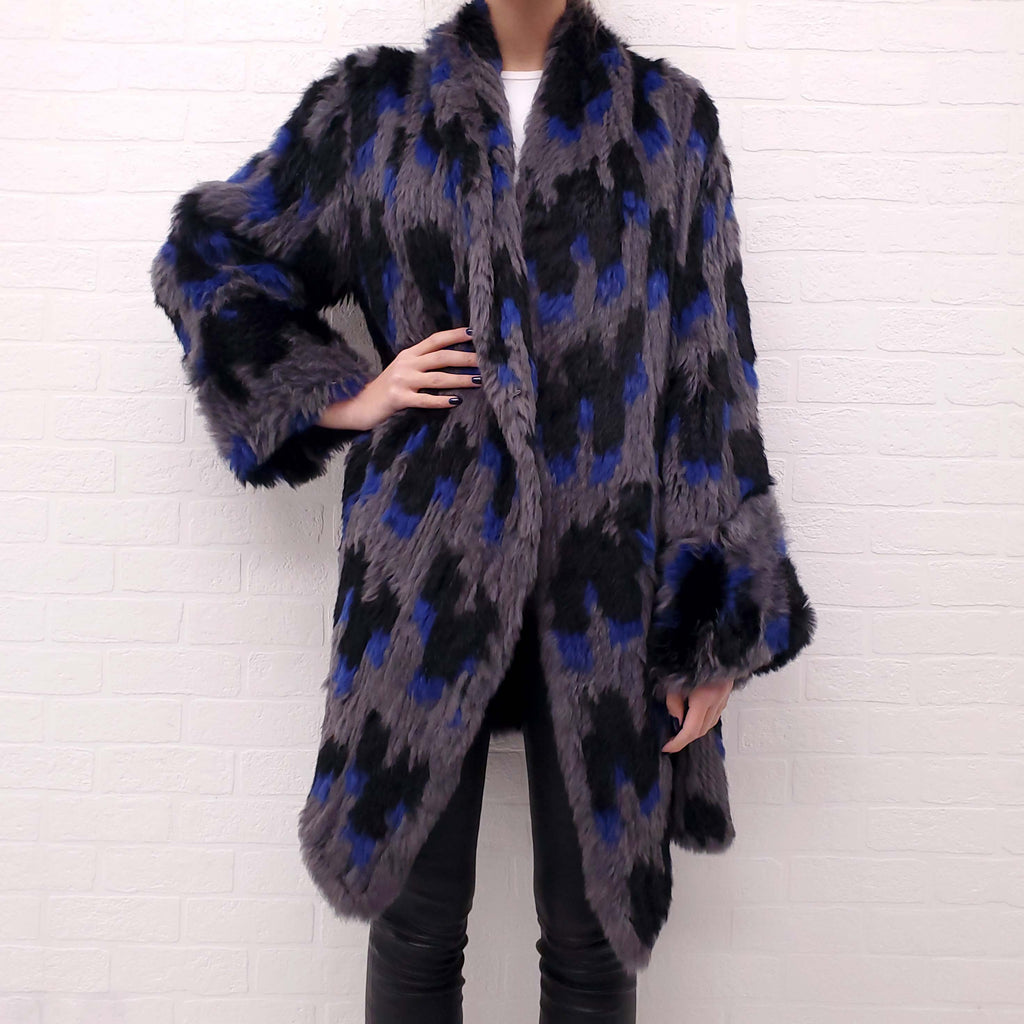 ANTIK BATIK GREY, BLACK AND BLUE RABBIT FUR JACKET - SIZE S