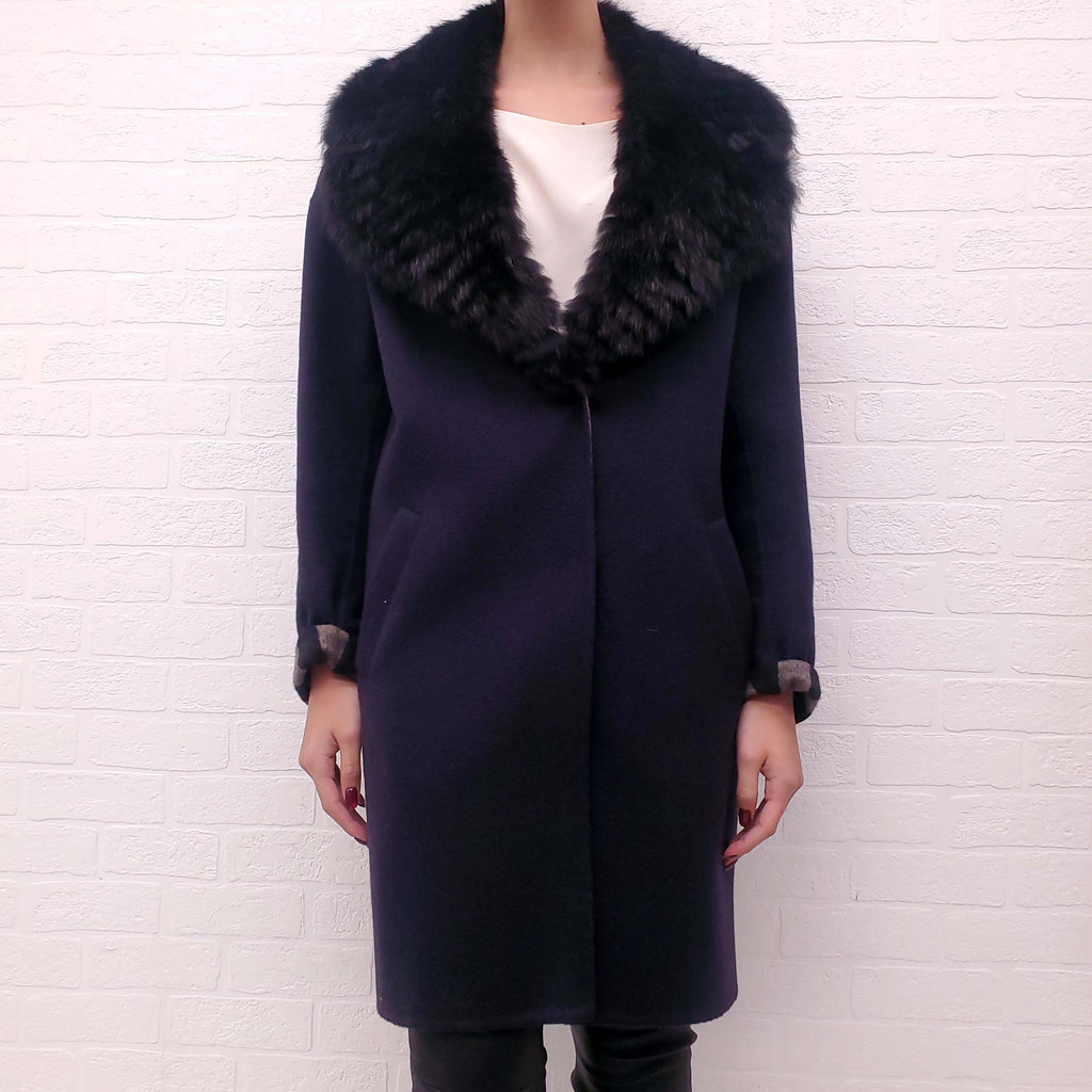 FENDI NAVY CASHMERE COAT WITH BLACK FUR - SIZE 42
