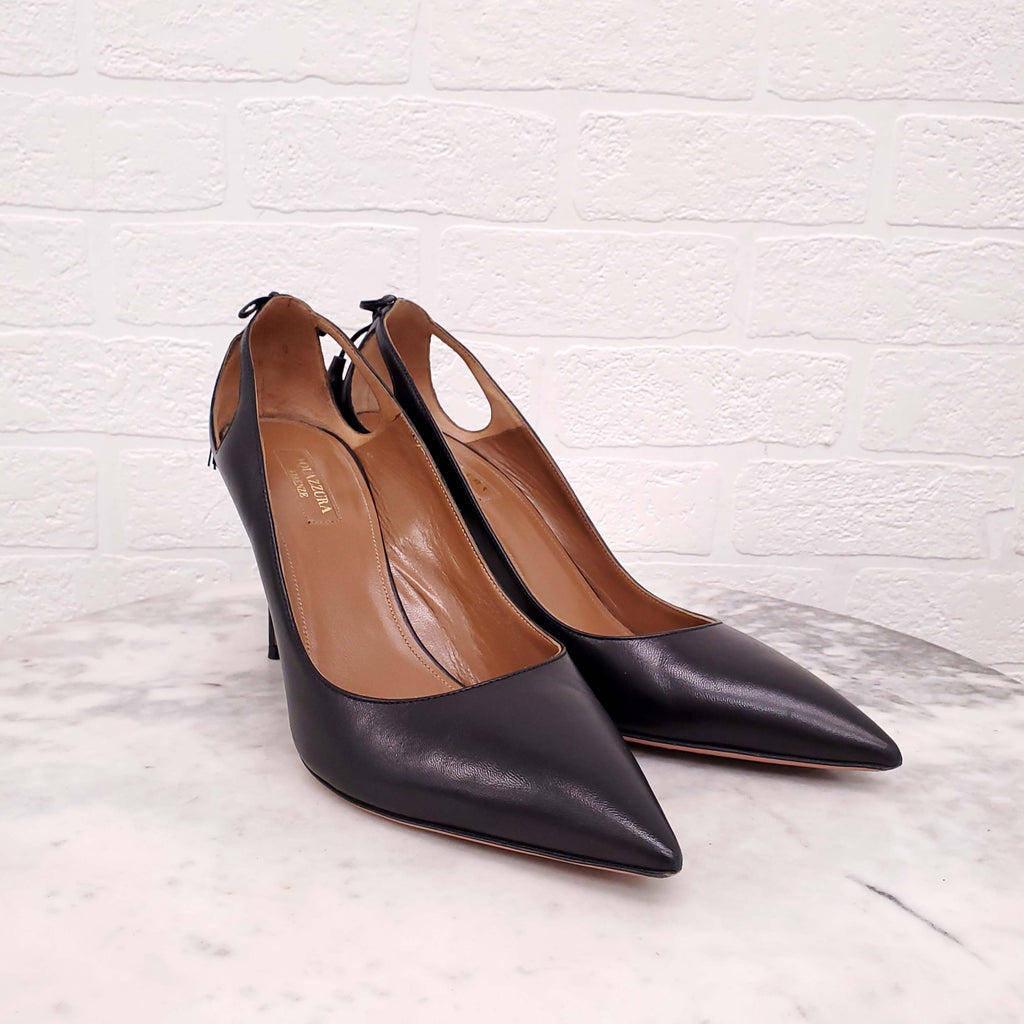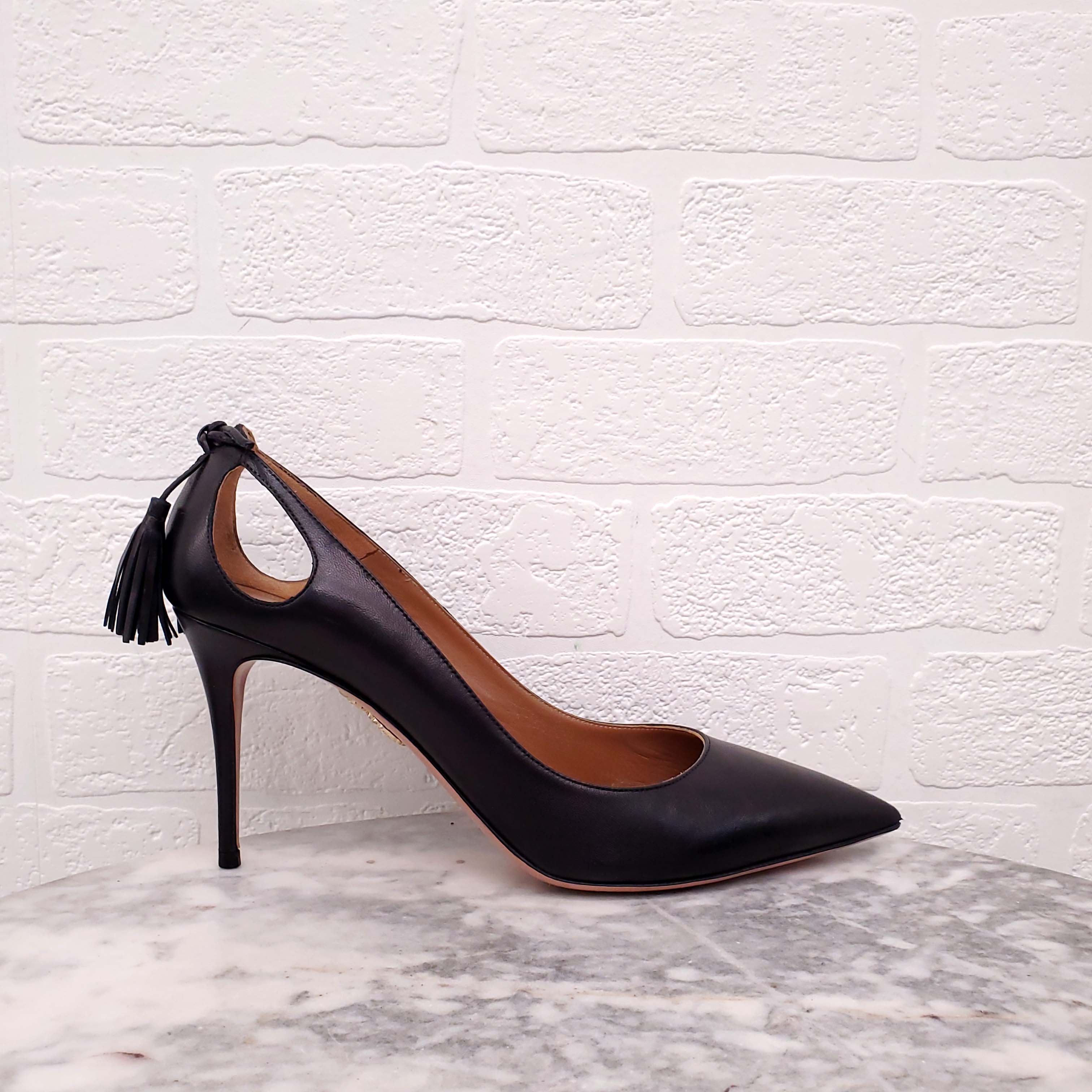 AQUAZZURA BLACK LEATHER KITTEN HEELS WITH TASSELS - SIZE 41