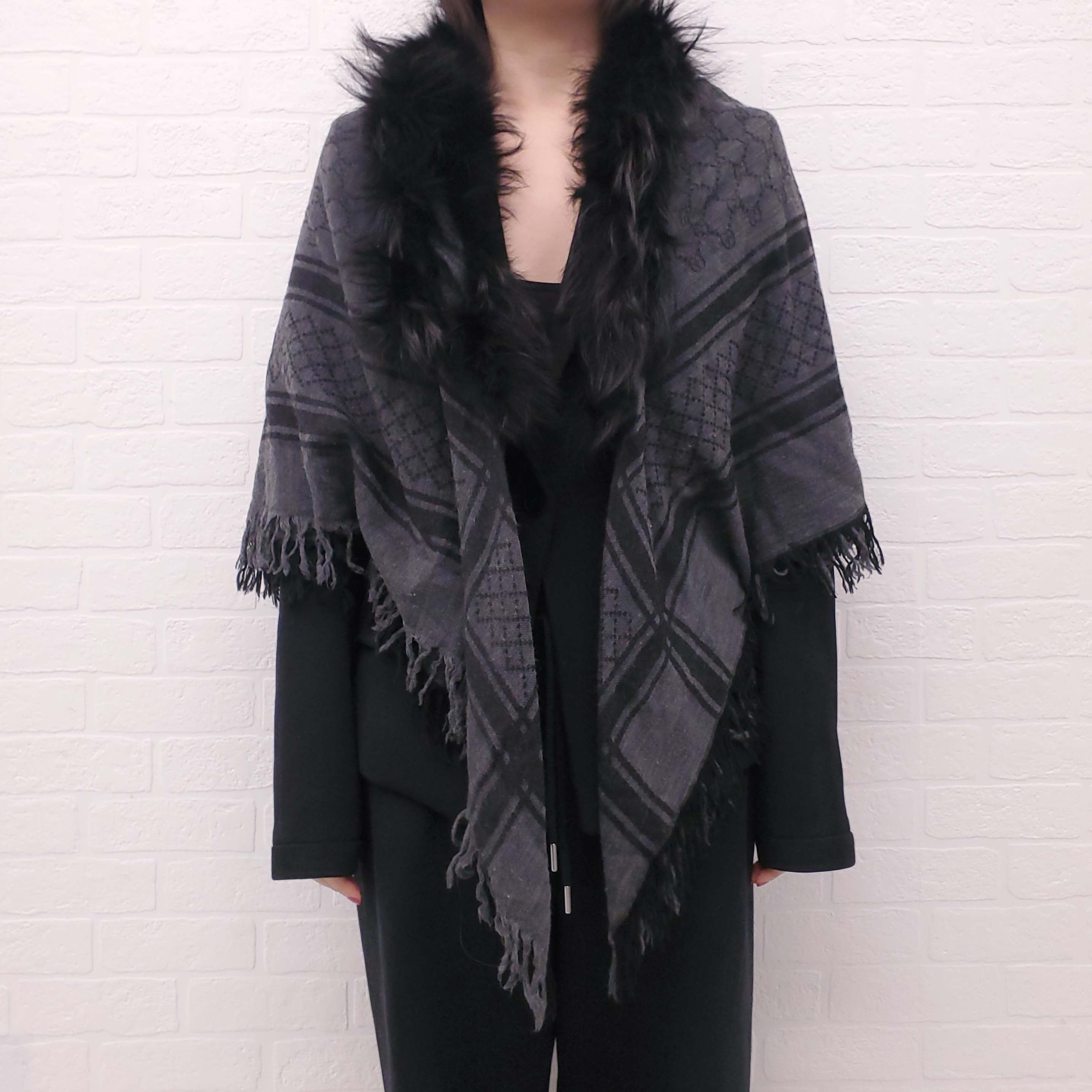 GUCCI CHARCOAL GREY AND BLACK LOGO SCARF WITH FOX FUR