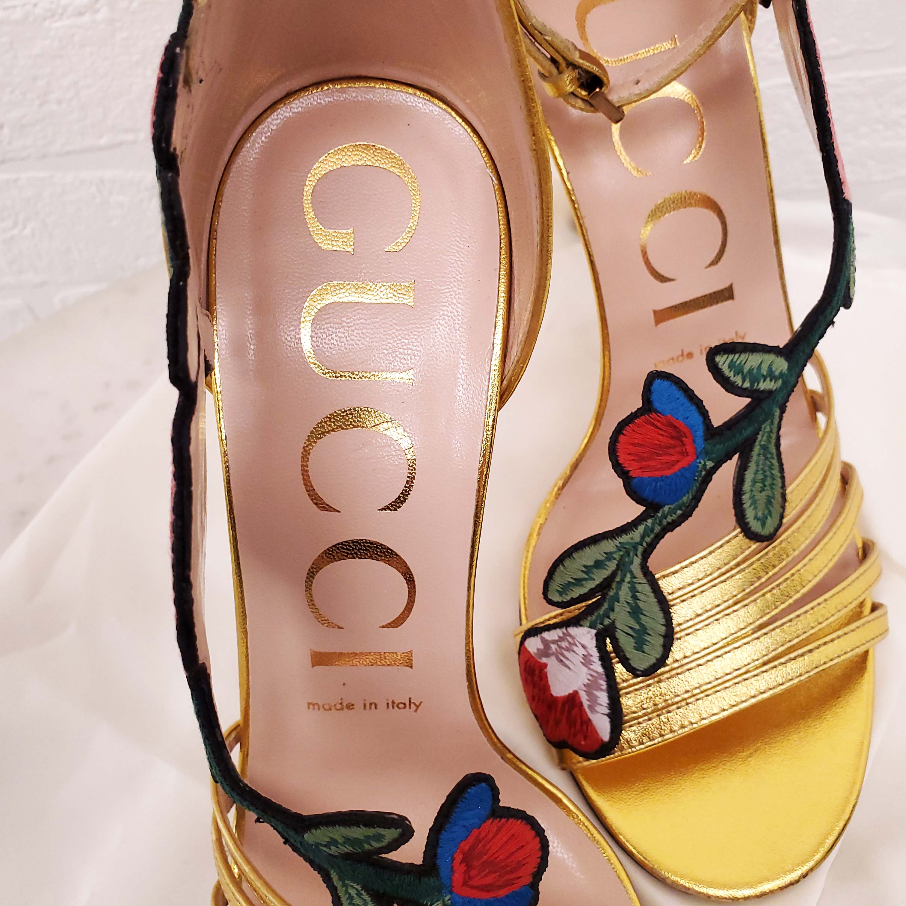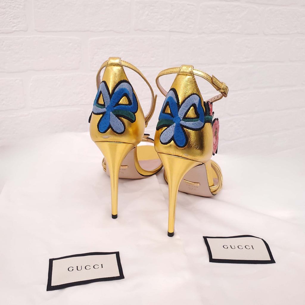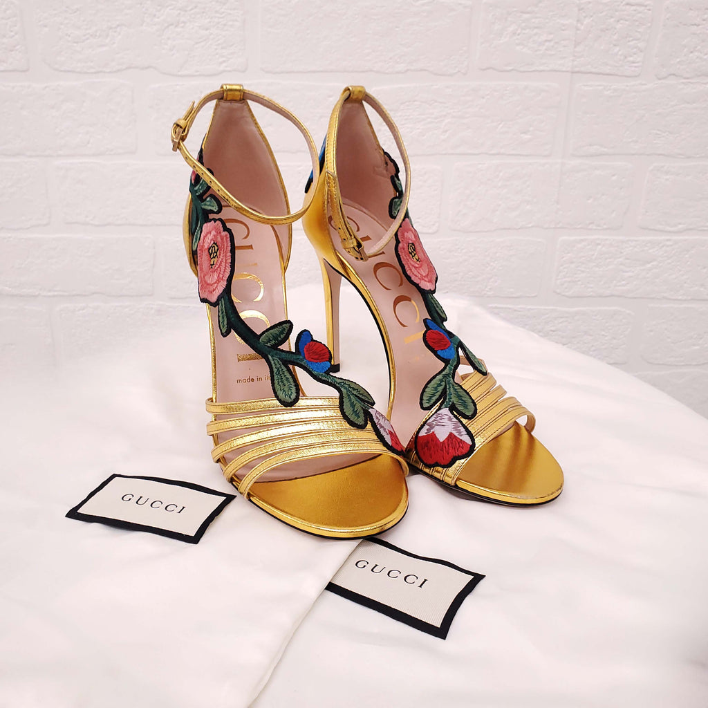 GUCCI GOLD FLORAL EMBOIRDERED HEELS - SIZE 37.5