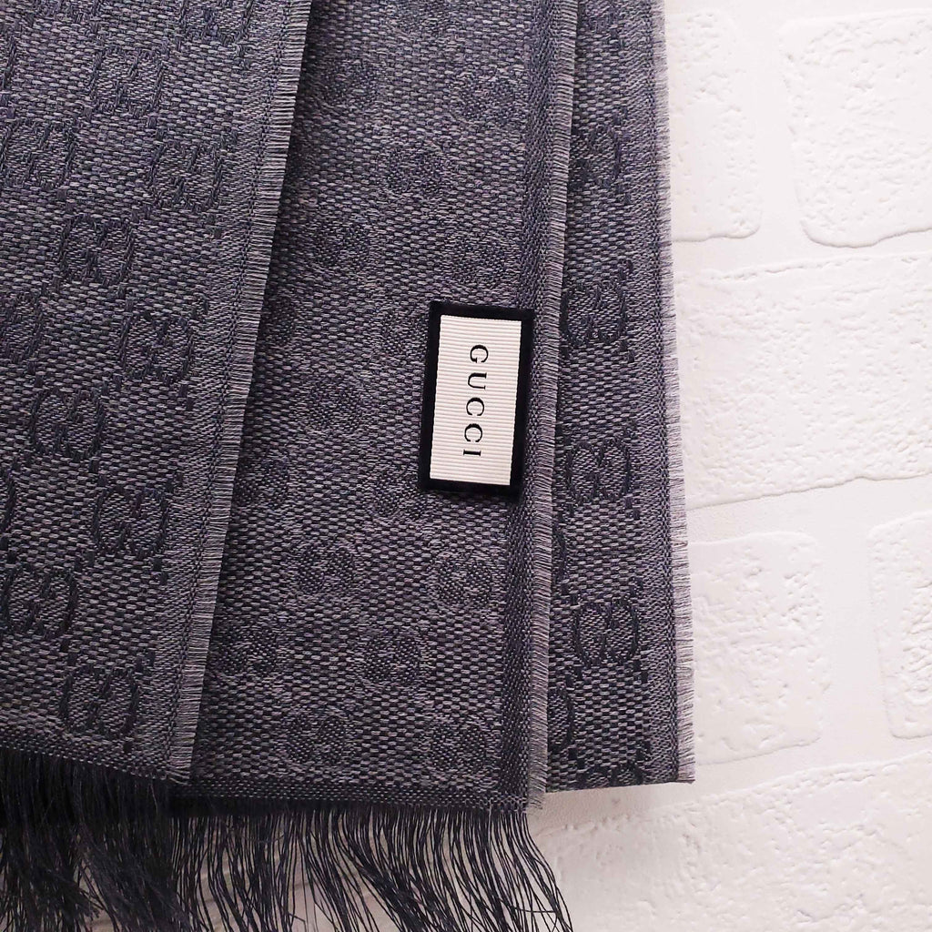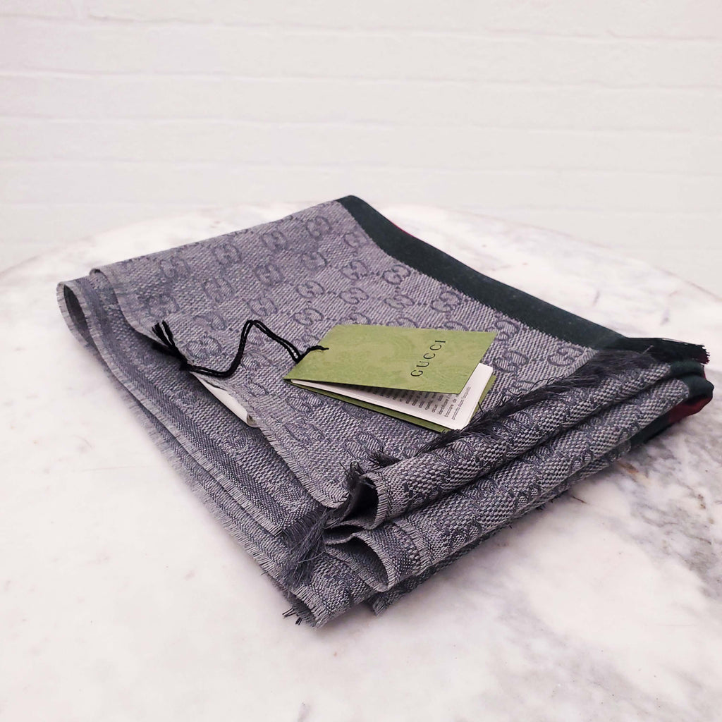 GUCCI GREY LOGO SCARF WITH WEB DETAIL