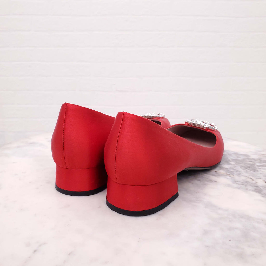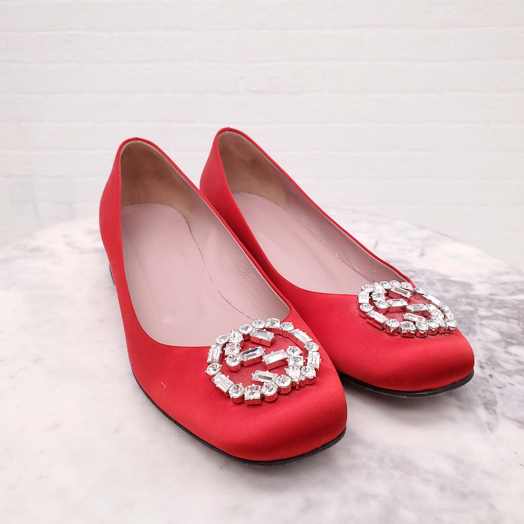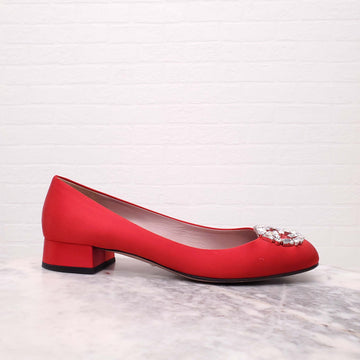 GUCCI RED SATIN CRYSTAL LOGO BLOCK HEELS - SIZE 41