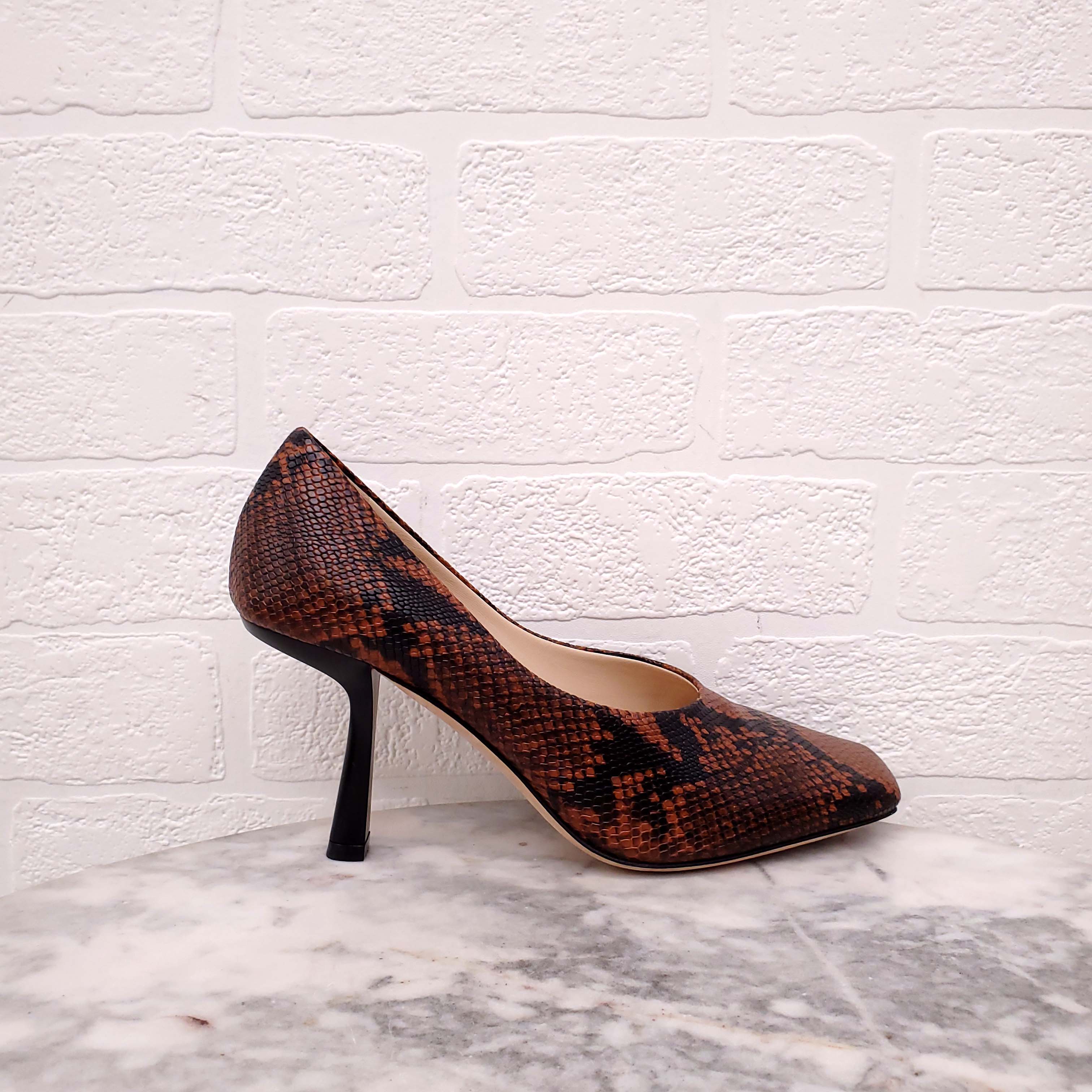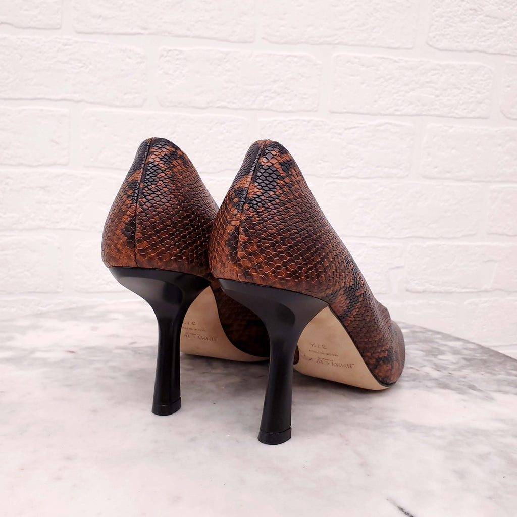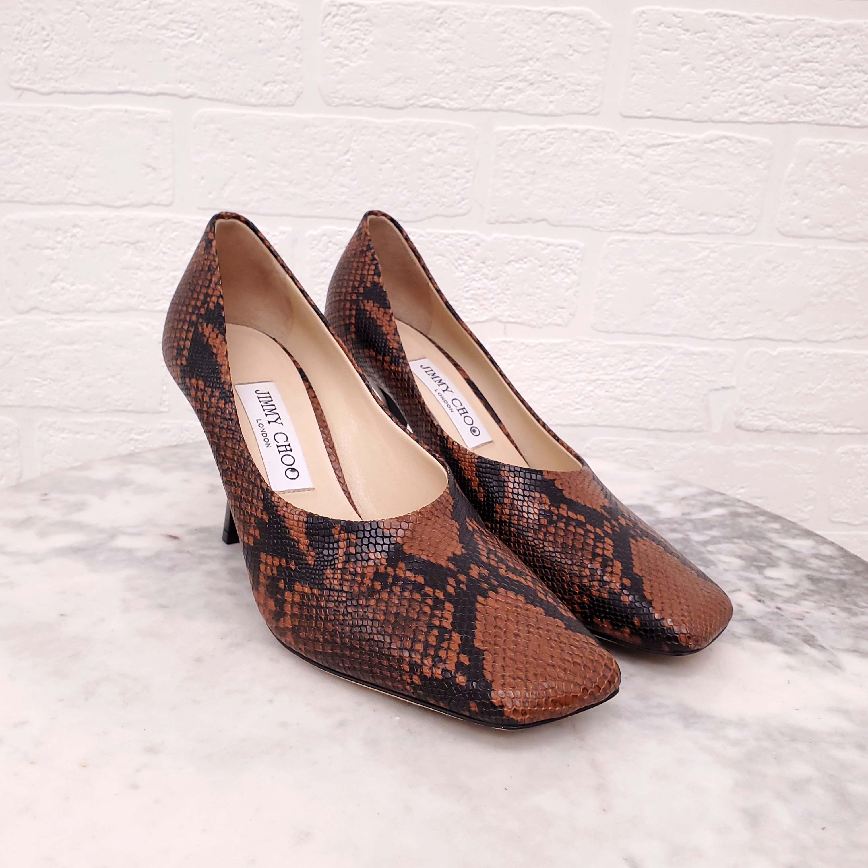 JIMMY CHOO BROWN SNAKESKIN SQUARE TOE HEELS - SIZE 37.5