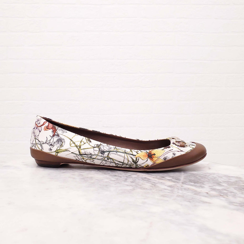 GUCCI FLORAL FLATS WITH BROWN LEATHER AND HORSEBIT DETAIL - SIZE 41
