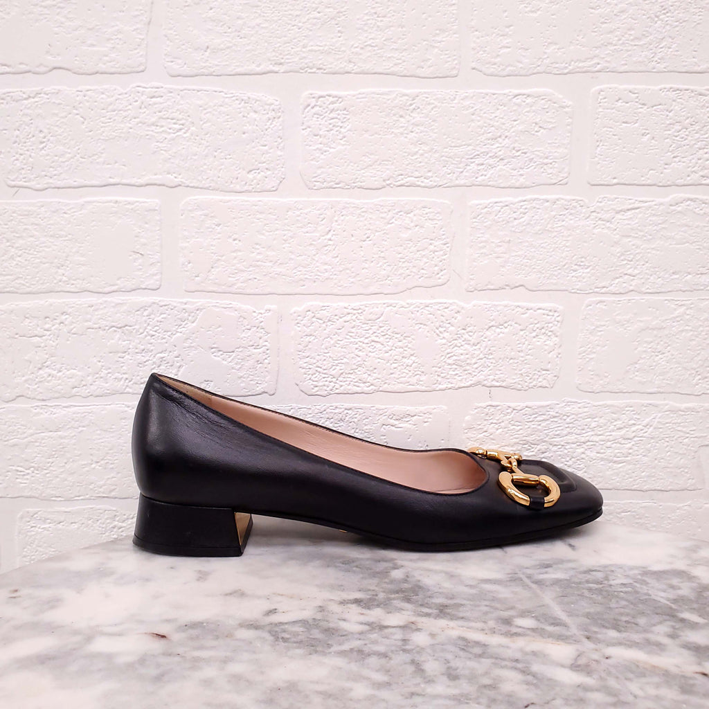 GUCCI BLACK HORSEBIT SQUARE TOE BLOCK HEELS - SIZE 37.5