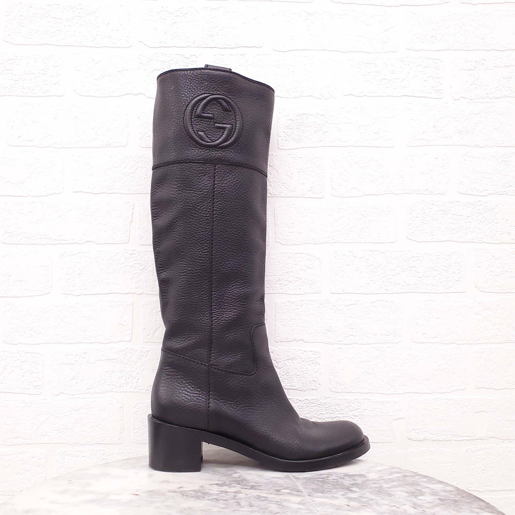 GUCCI BLACK LEATHER RIDING BOOTS WITH LOGO - SIZE 37.5