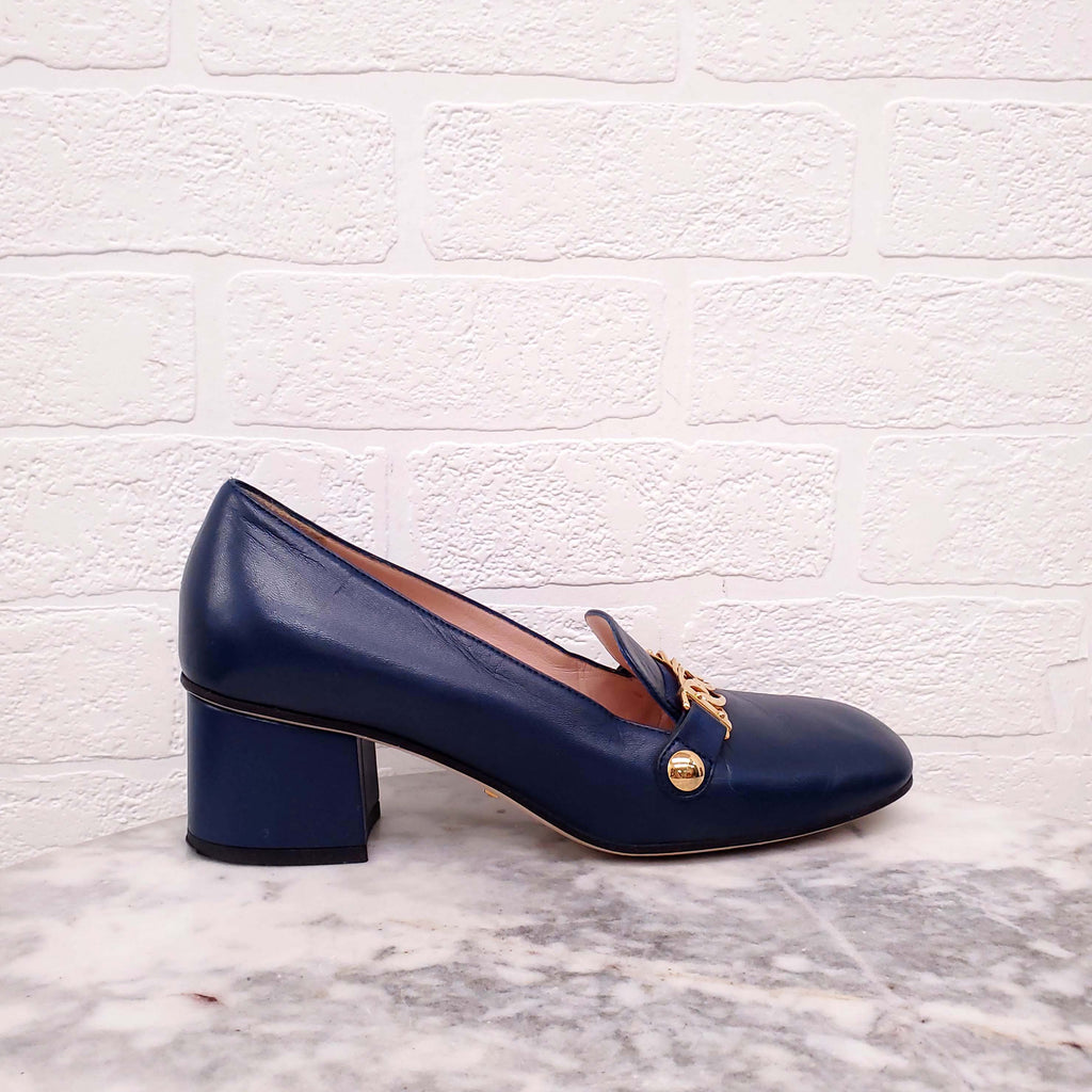 GUCCI BLUE LEATHER BLOCK HEELS WITH CHAIN AND RIBBON DETAIL - SIZE 37.5