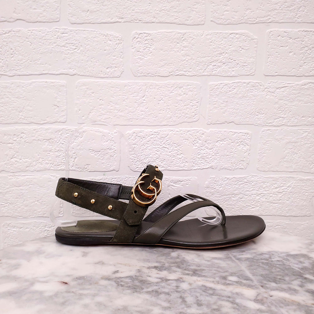 GUCCI GREEN LEATHER AND SUEDE LOGO SANDALS - SIZE 37.5