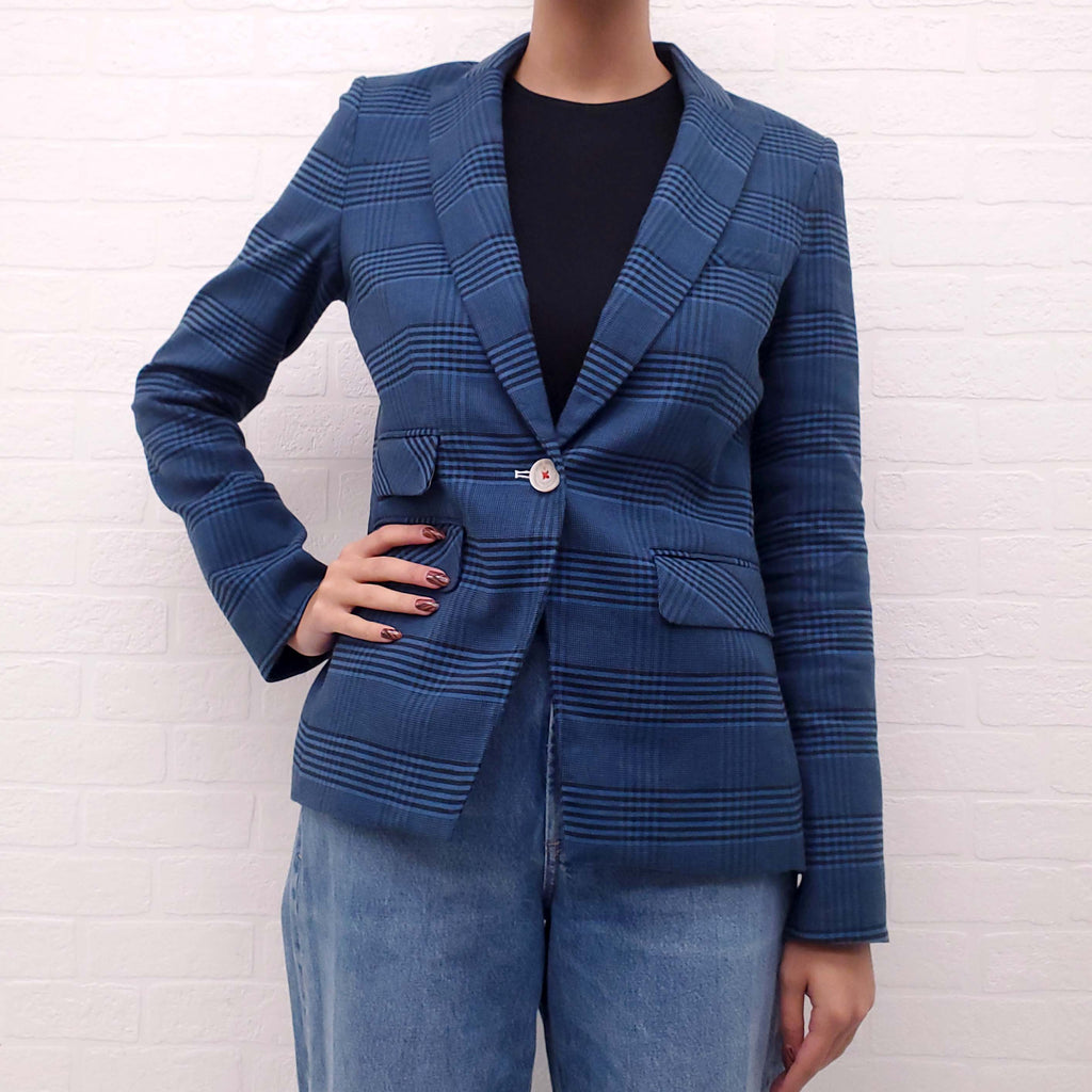 VERONICA BEARD BLUE PLAID DICKIE BLAZER WITH ELBOW PATCHES - SIZE 6