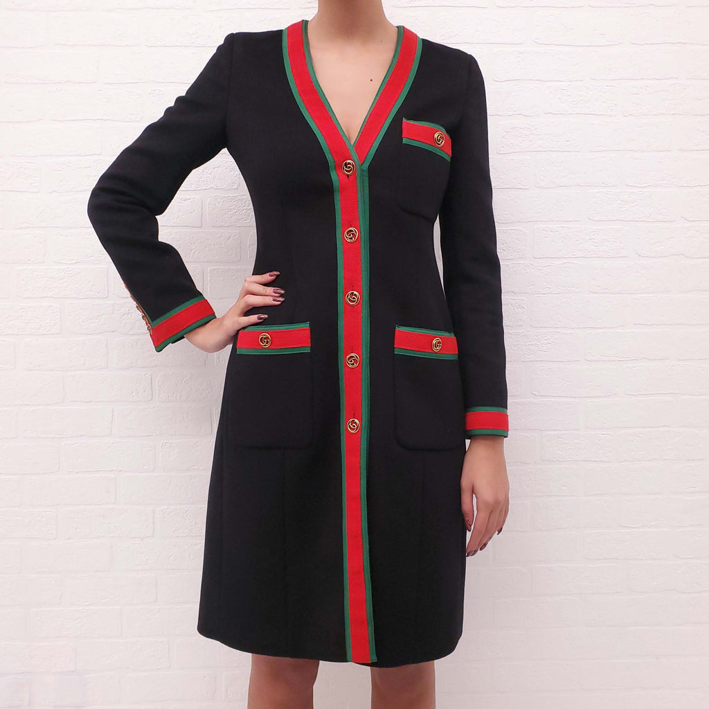 GUCCI BLACK DRESS WITH WEB RIBBON AND LOGO BUTTONS - SIZE 36