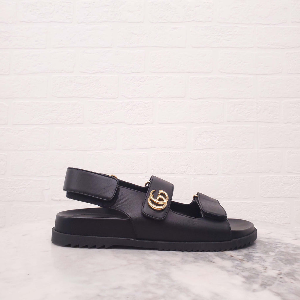 GUCCI BLACK LEATHER DAD SANDALS WITH GOLD LOGO - SIZE 37