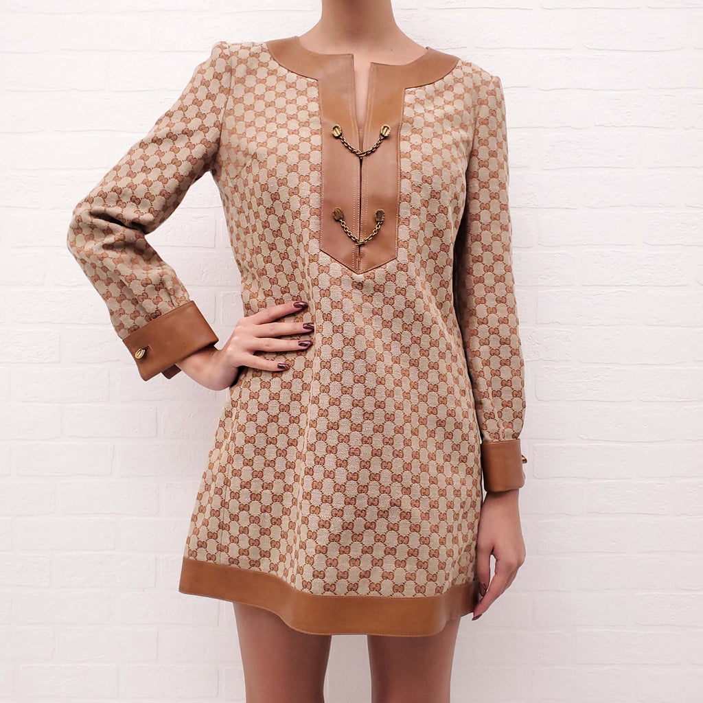 GUCCI 'LIGHT LINEN CANVAS GG WITH TAN LEATHER' DRESS - SIZE 40