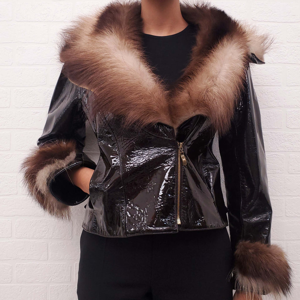 OSCAR DE LA RENTA BROWN PATENT JACKET WITH FUR DETAIL - SIZE 4