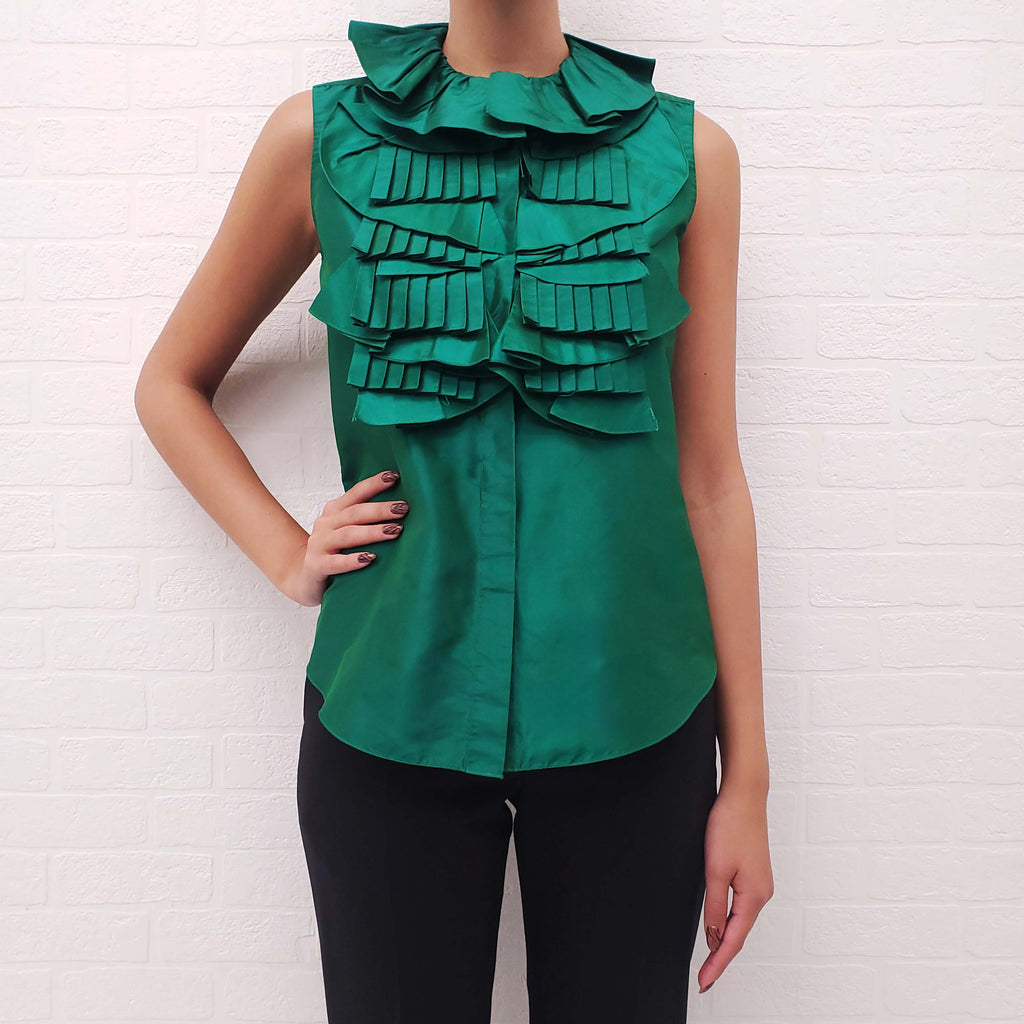 OSCAR DE LA RENTA GREEN TAFFETA PLEATED SLEEVELESS BLOUSE - SIZE 4