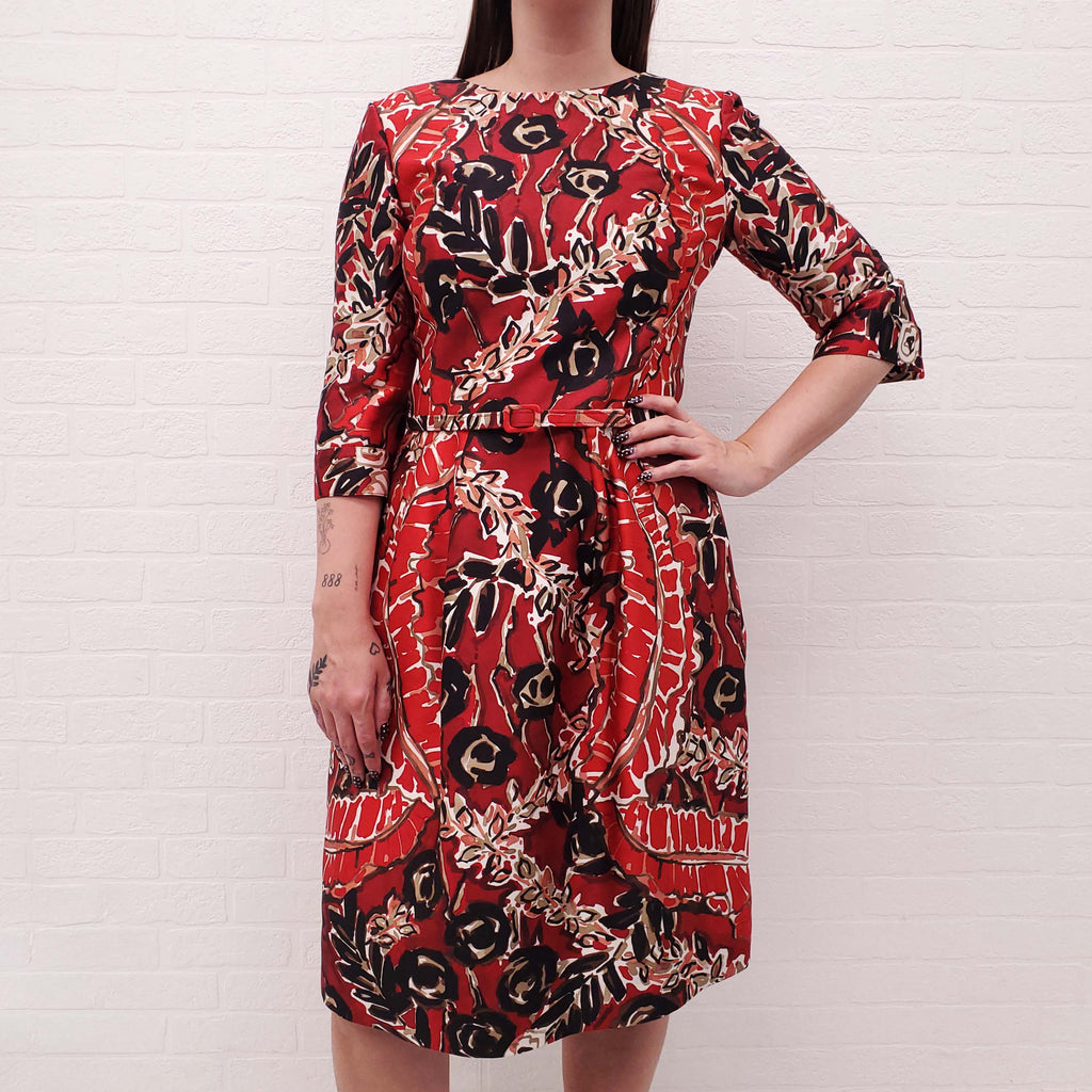 OSCAR DE LA RENTA RED PATTERNED DRESS WITH BELT - SIZE 8