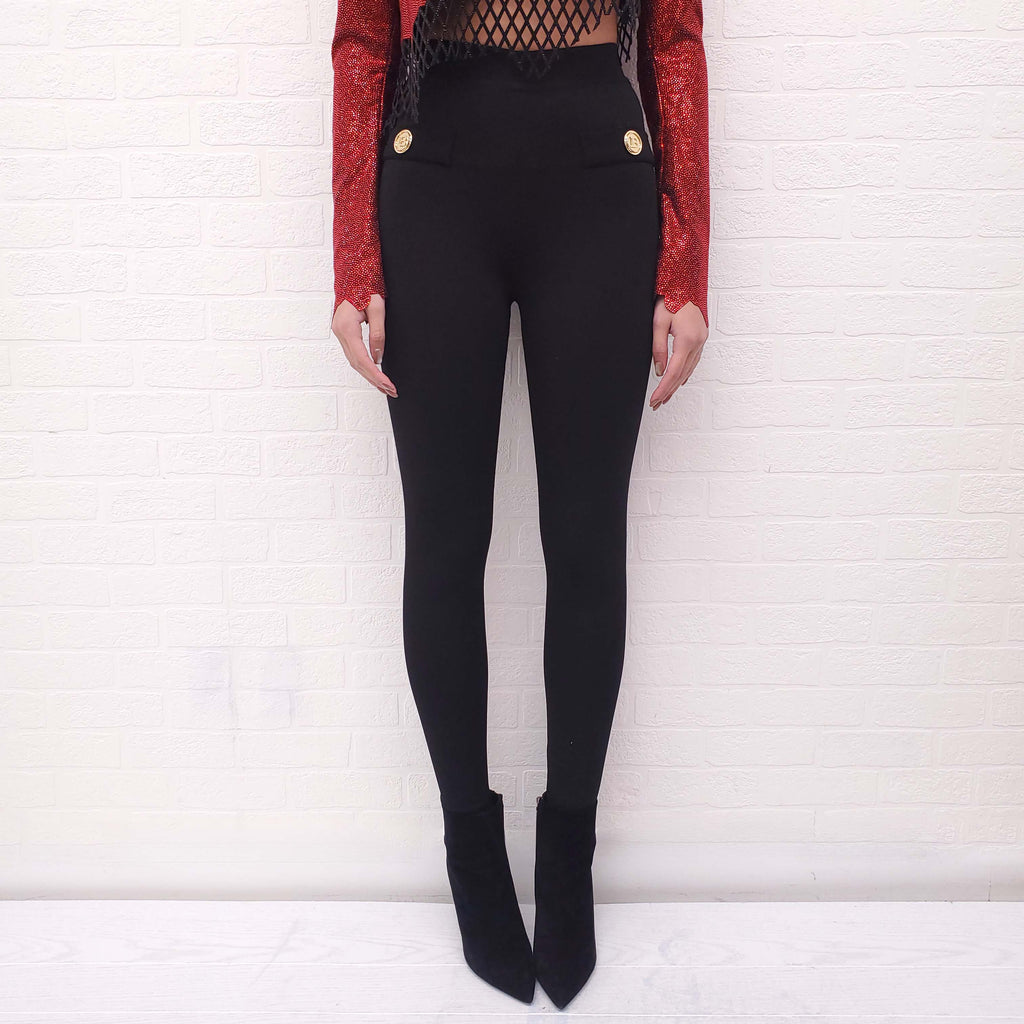 BALMAIN BLACK PANTS WITH GOLD LOGO BUTTONS - SIZE 36