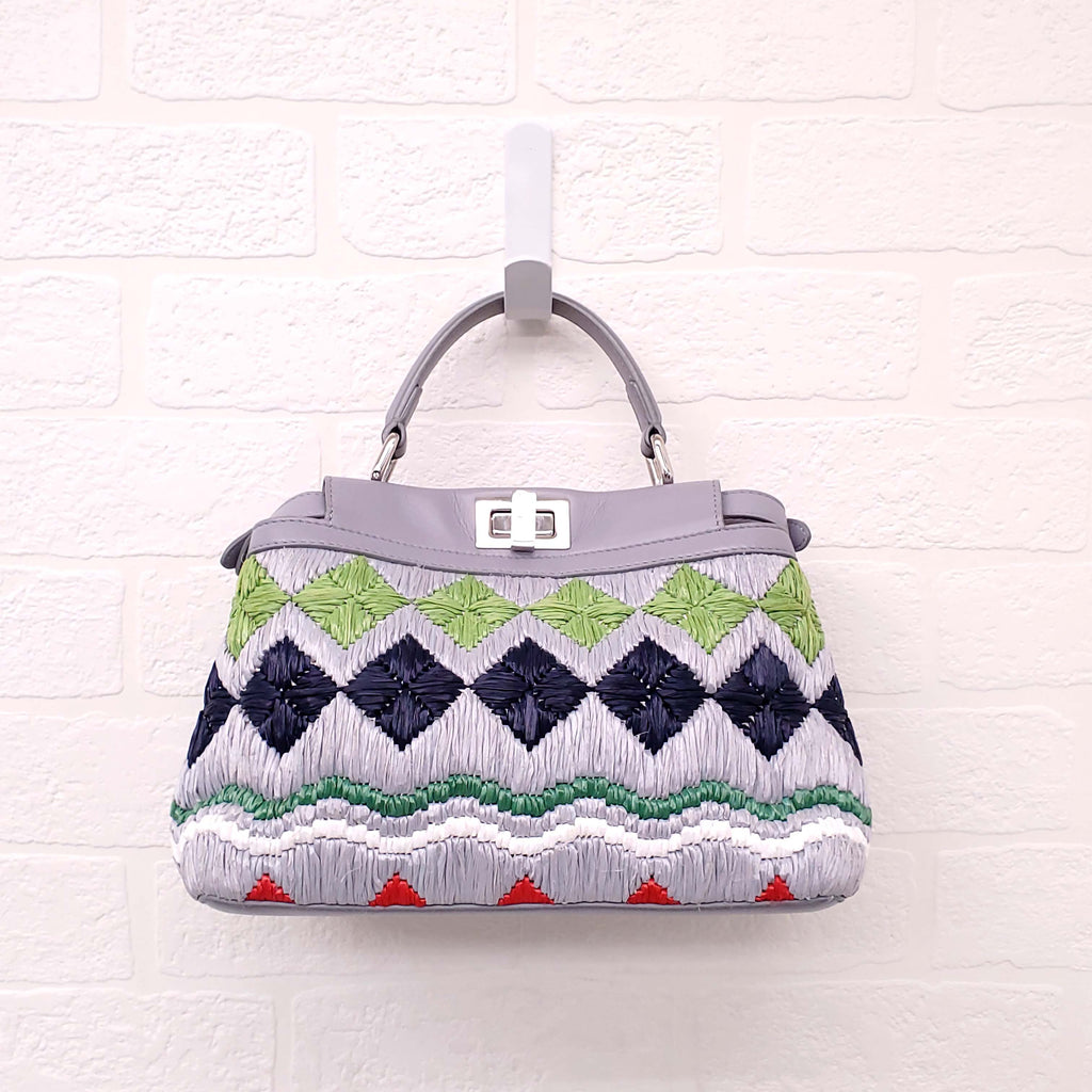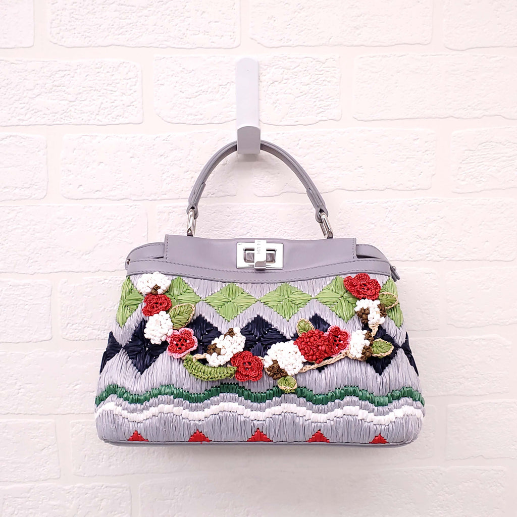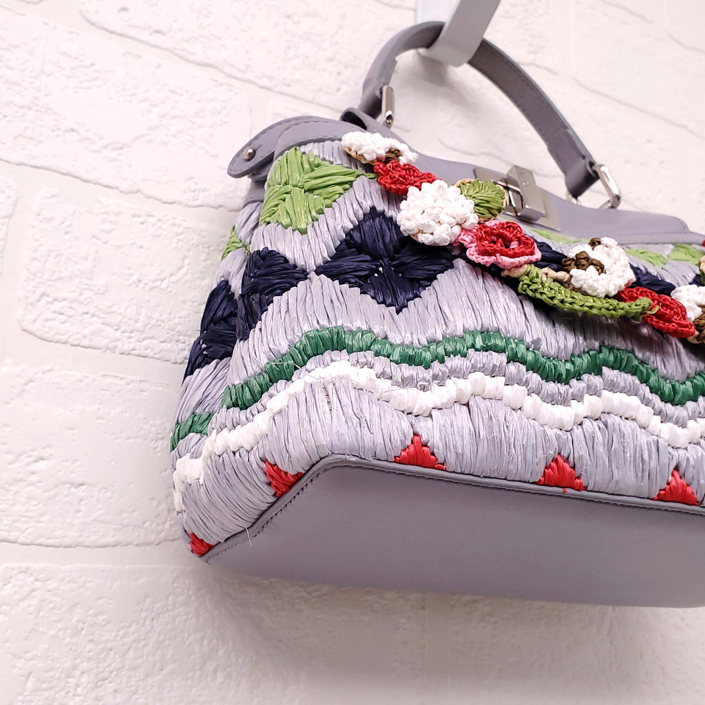 FENDI GREY LEATHER AND COLOURFUL RAFFIA FLORAL MINI PEEKABOO BAG