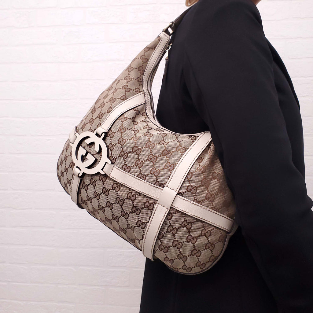 GUCCI CANVAS AND WHITE LEATHER LOGO SHOULDER BAG