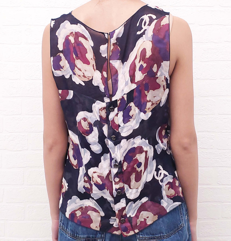 CHANEL NAVY FLORAL LOGO SILK TANK TOP WITH MATCHING CROPPED JACKET - SIZE 44 TOP/42 JACKET