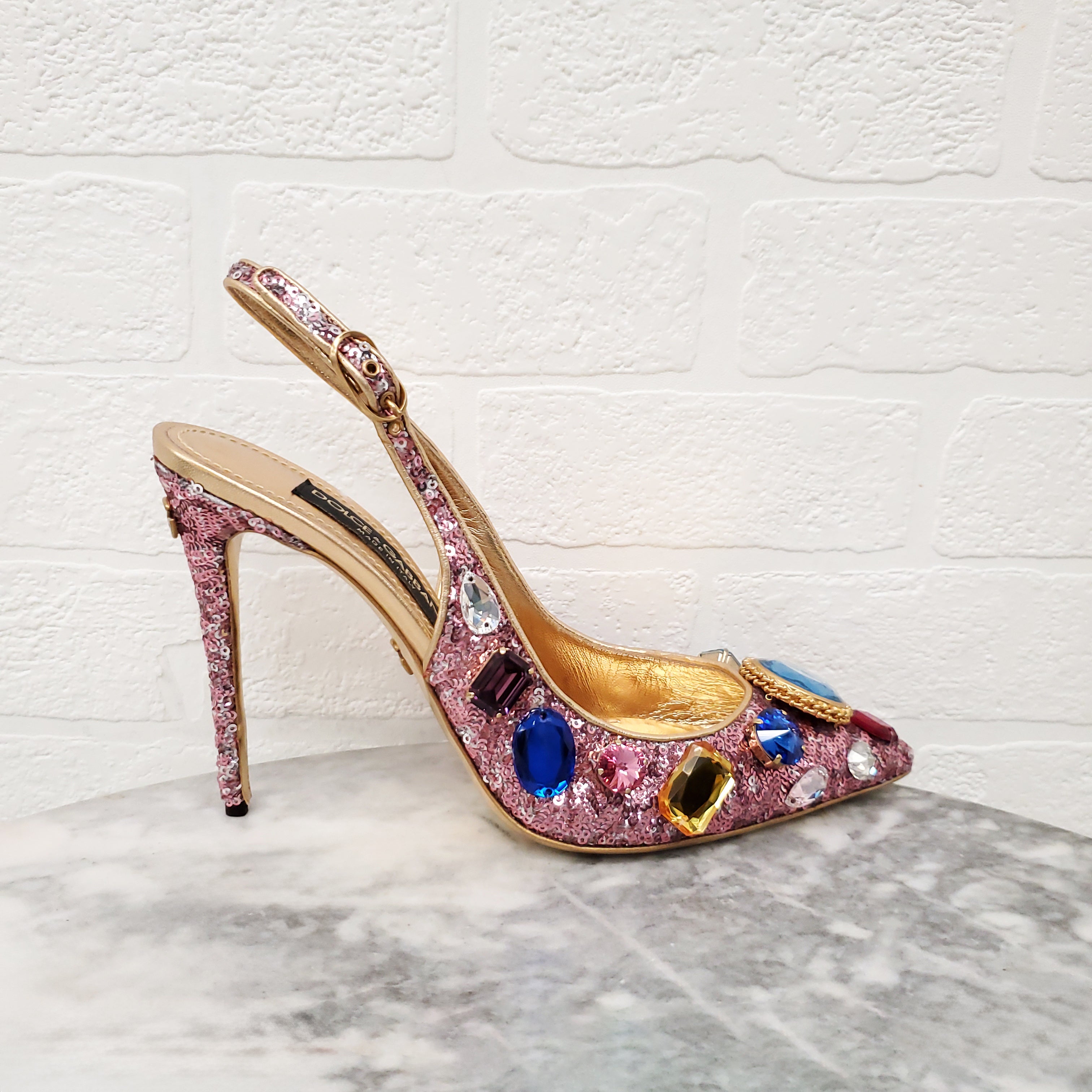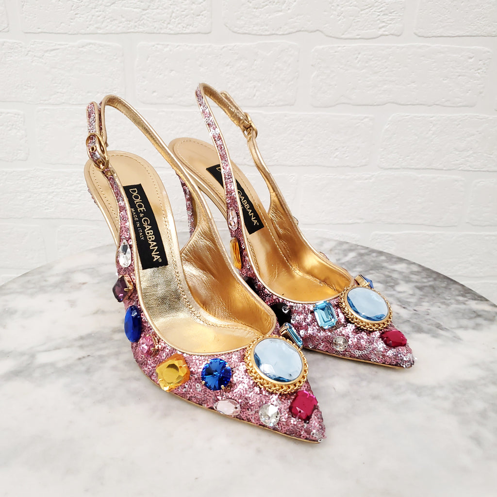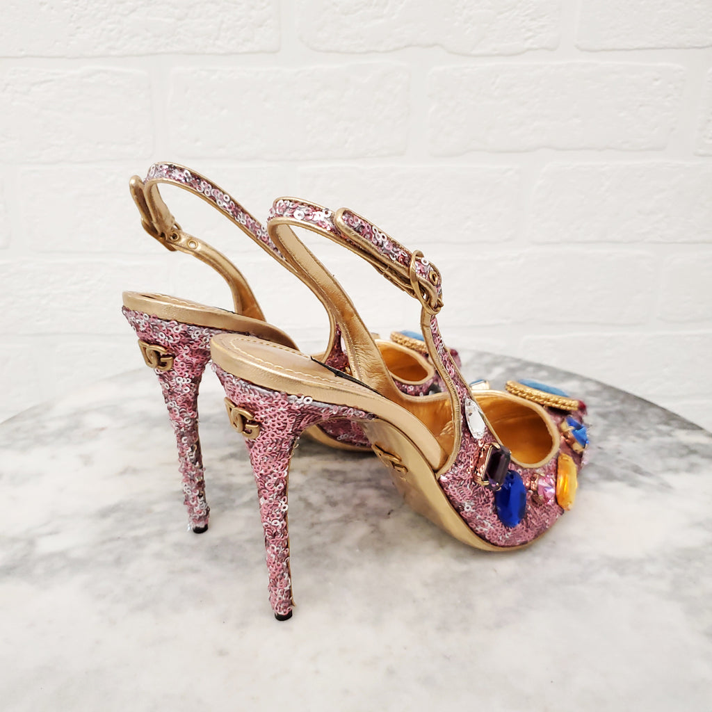DOLCE & GABBANA PINK SEQUIN GEM EMBELLISHED SLING BACK HEELS - SIZE 40