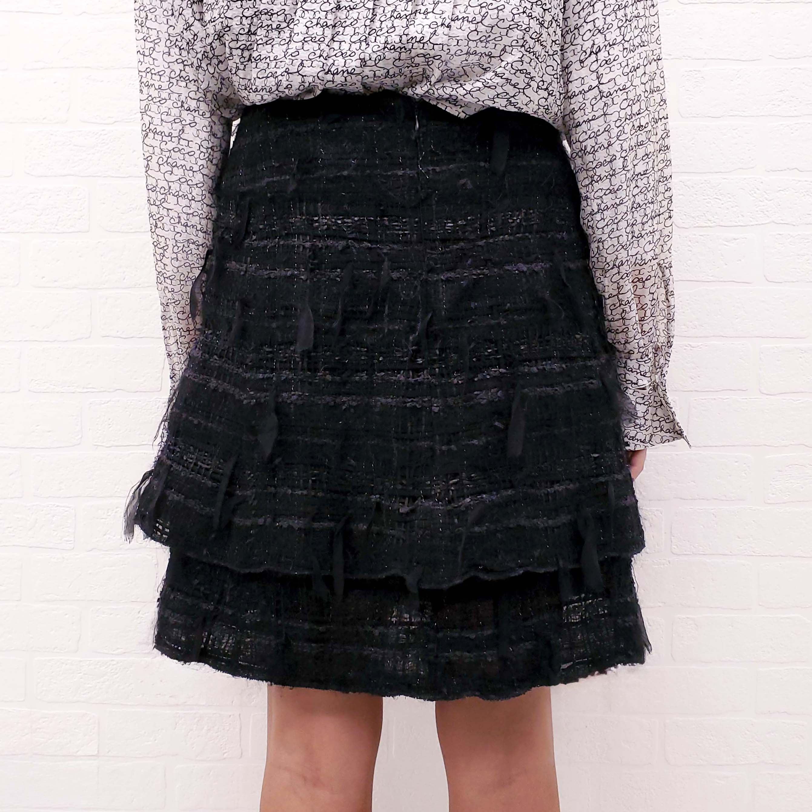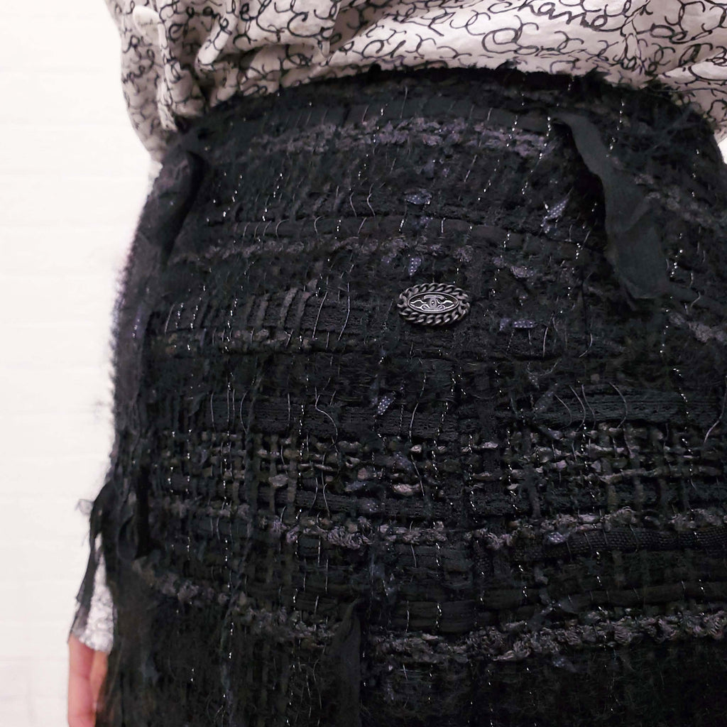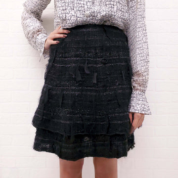 CHANEL BLACK TWEED FRINGE SKIRT WITH LOGO DETAIL - SIZE 38