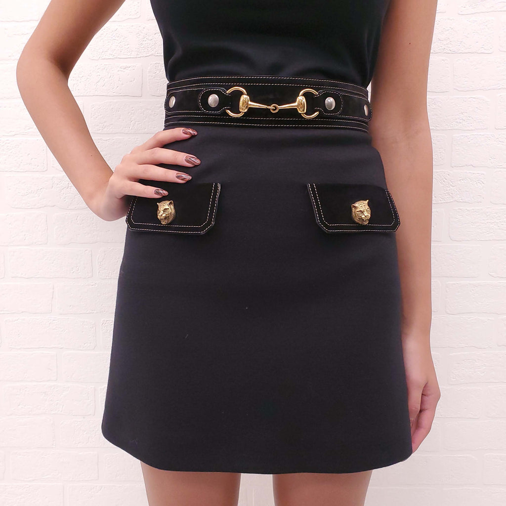 GUCCI BLACK KNIT AND SUEDE SKIRT WITH TIGER BUTTONS AND HORSEBIT DETAIL - SIZE 38